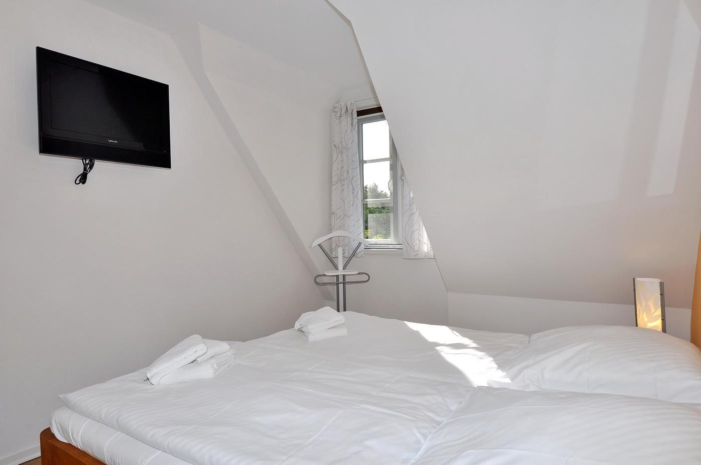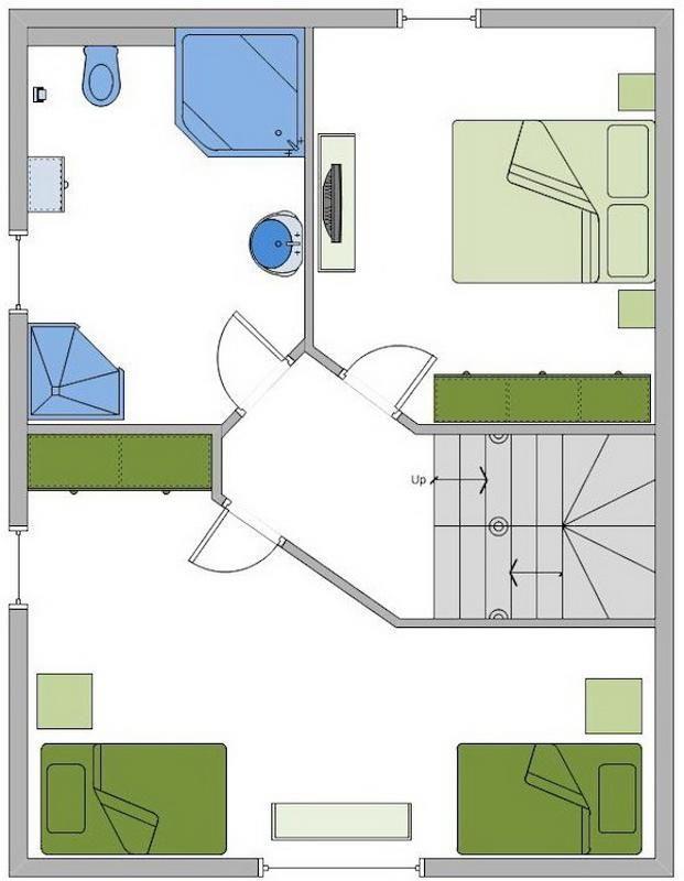 Obergeschoss: ein Schlafzimmer mit Doppelbett (180 x 200 cm), ein Schlafzimmer mit 2 Einzelbetten (je 100 x 200 cm), ein Wannenbad mit separater Dusche