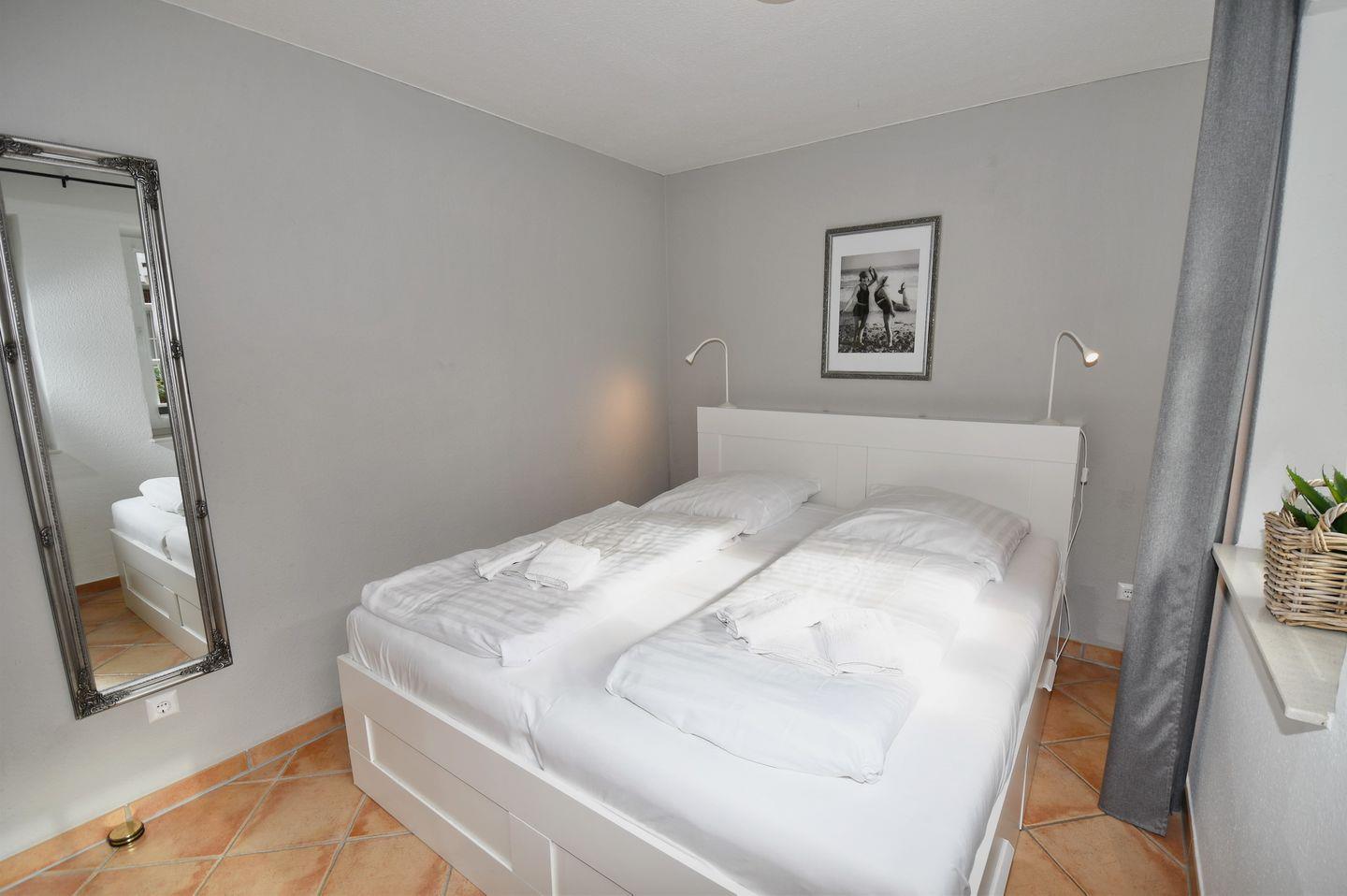 Eingangsbereich, Wohnraum mit integrierter Küche, Essbereich und Zugang zur Terrasse, ein Schlafzimmer mit Boxspringbett (180 x 200 cm), ein Duschbad /WC
