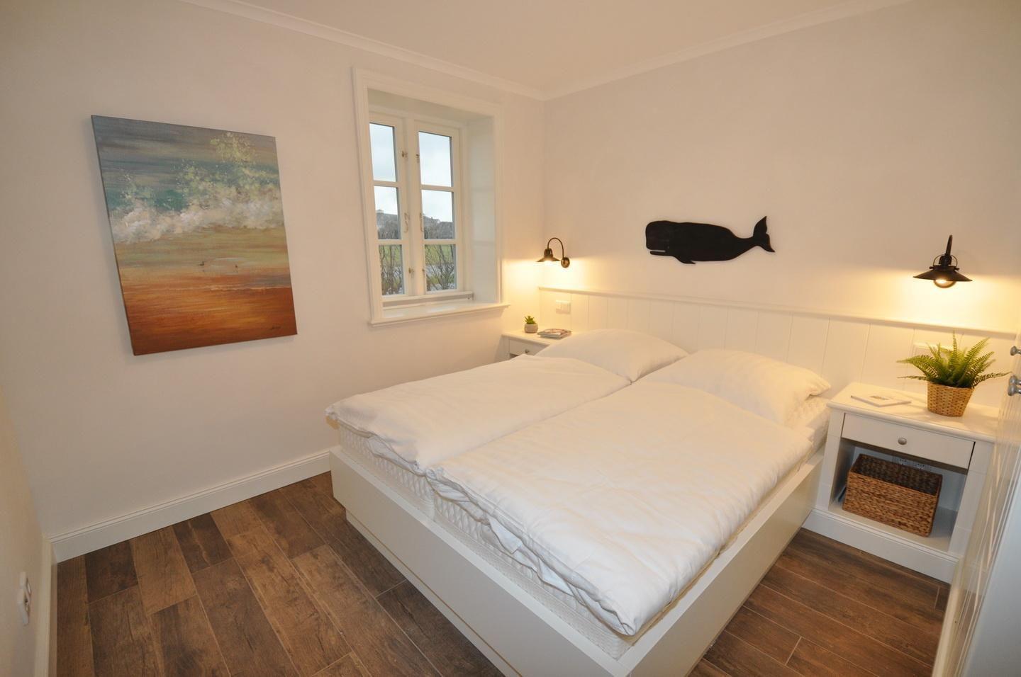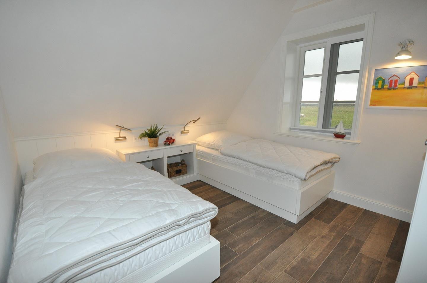 Obergeschoss: ein Schlafzimmer mit Doppelbett (180 x 200 cm - Einzelmatratzen) und TV, ein Schlafzimmer mit 2 Einzelbetten (je 90 x 200 cm), ein Duschbad / WC mit Handtuchwärmer und Sauna