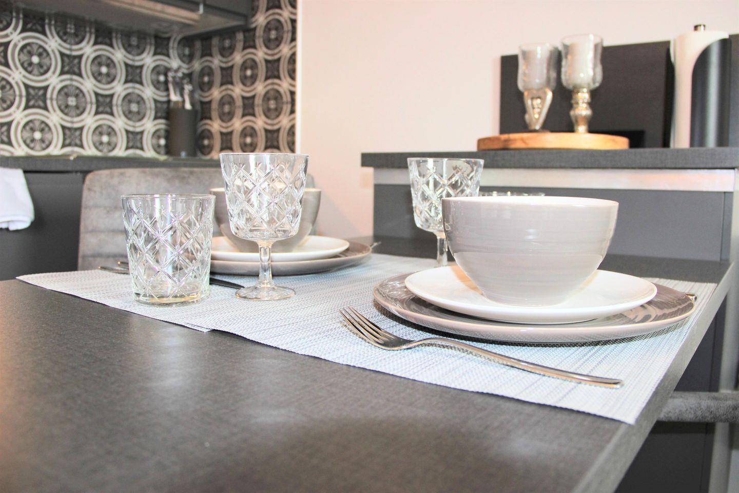 Der kombinierte Wohn- und Schlafbereich ist der zentrale Ort der Wohnung. Du findest hier ein bequemes Sofa zum Entspannen und große Fenster, die viel Licht hereinlassen und den Blick auf die Natur freigeben. Eine voll ausgestattete Küchenzeile mit Herd, Backofen, Kühlschrank, Kaffeevollautomat, Spülmaschine und Mikrowelle steht Dir zur Verfügung. Der kleine Essbereich bietet Platz für zwei Personen. Das Bad ist modern und mit einer ebenerdigen Dusche, Waschbecken und WC ausgestattet.