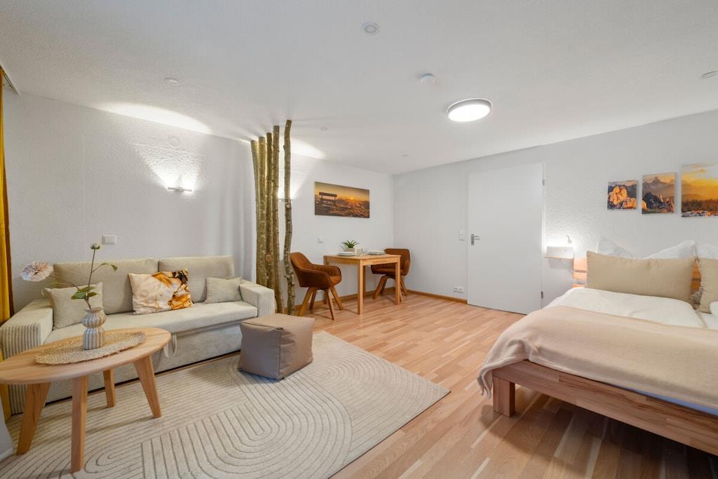 Välkommen till Albmatte Upplev en harmonisk blandning av natur, komfort och oförglömliga stunder på Albmatte. Vårt charmiga semesterhus kombinerar kärleksfullt inredda lägenheter i varierande storlek med en autentisk, mysig atmosfär – perfekt anpassade efter dina individuella behov. Vår lägenhet A3 har ett kombinerat vardagsrum, matsal och sovrum, helt renoverad och möblerad i modern stil. - Direkt tillgång till terrassen och trädgården - Dubbelsäng (160 cm) och bäddsoffa - Fullt utrustat kök med vattenkokare, brödrost och kaffebryggare - Modernt badrum