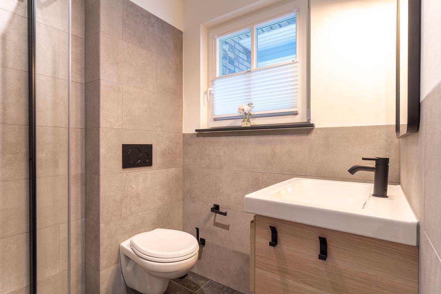 Vom Wohnzimmer gelangen Sie auf eine gemütliche, sonnige Süd Terrasse mit stylischen Gartenmöbeln. An dem Wohnflur mit Garderobe schließt sich ein Duschbad an.