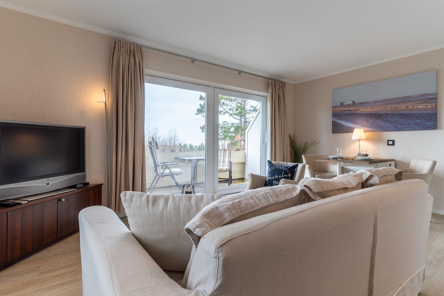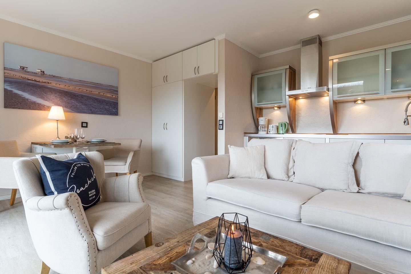 Die gesamte Wohnung ist mit sehr exclusiven Möbeln von Riviera Maison eingerichtet. Ein gemütliches Wohnzimmer mit offener Wohnküche und großzügigen Esstisch laden zum Chillen ein. Das Schlafzimmer mit 160er Doppelbett und Flatscreen TV sorgen für ruhevolle Erholung.