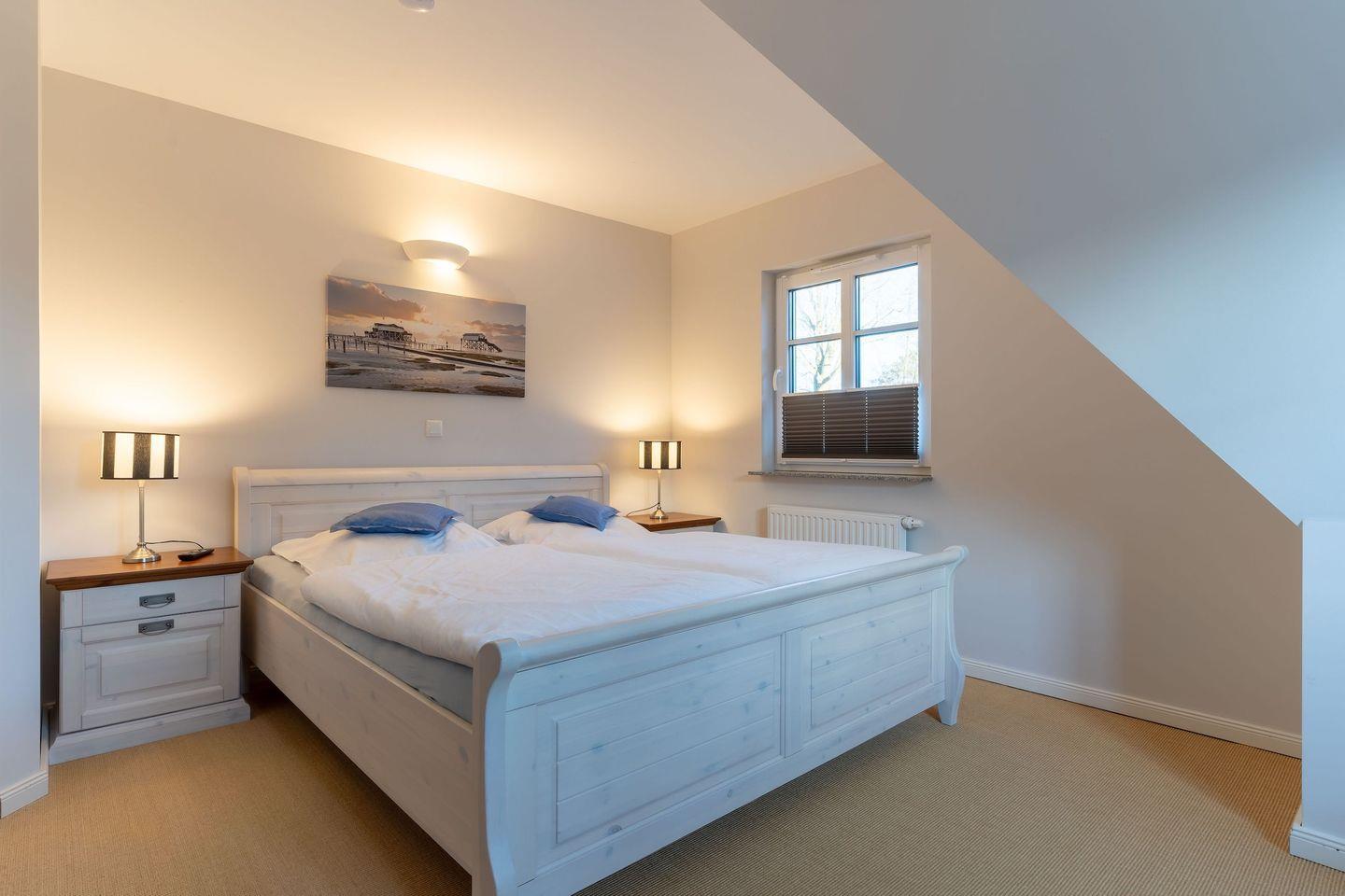 Über eine Holztreppe gelangt man in das Obergeschoss. Die beiden Schlafzimmer, jeweils mit einem Doppelbett sorgen für ruhevolle Erholung.