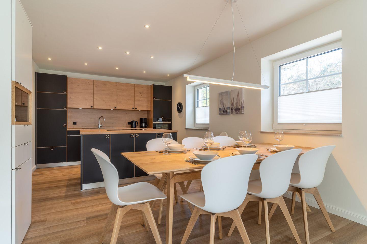 Die Küche verfügt über hochwertige Elektrogeräte und bietet genügend Platz zum gemeinsamen Kochen.