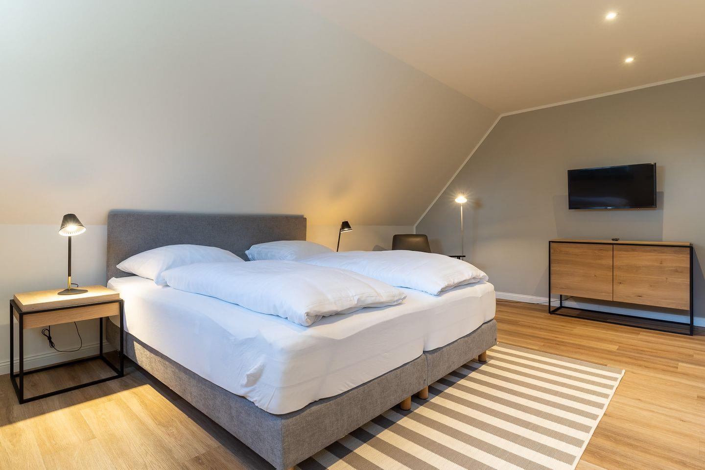 Zwei Schlafzimmer mit je einem Boxspring-Doppelbett (180x200 cm) sind ausgestattet mit TV und großen Kleiderschränken. Darüber hinaus befindet sich im Obergeschoss ein weiteres Duschbad.