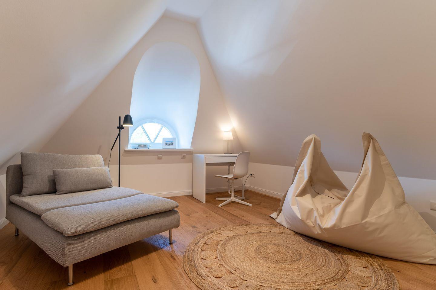 Im zweiten Obergeschoss mit Spitzboden finden Sie ein weiteres kleines Wohnzimmer mit ruhigem Arbeitsbereich und gemütlicher Leseliege - der perfekte Rückzugsort zum ungestörten Arbeiten oder als Spielzimmer für Kinder.