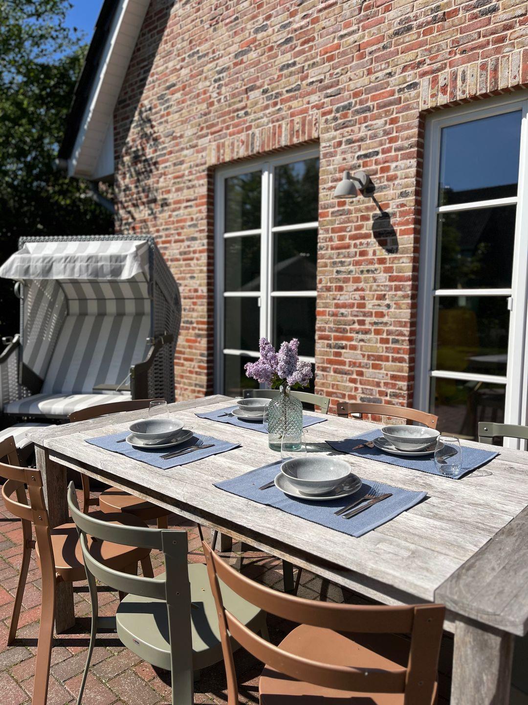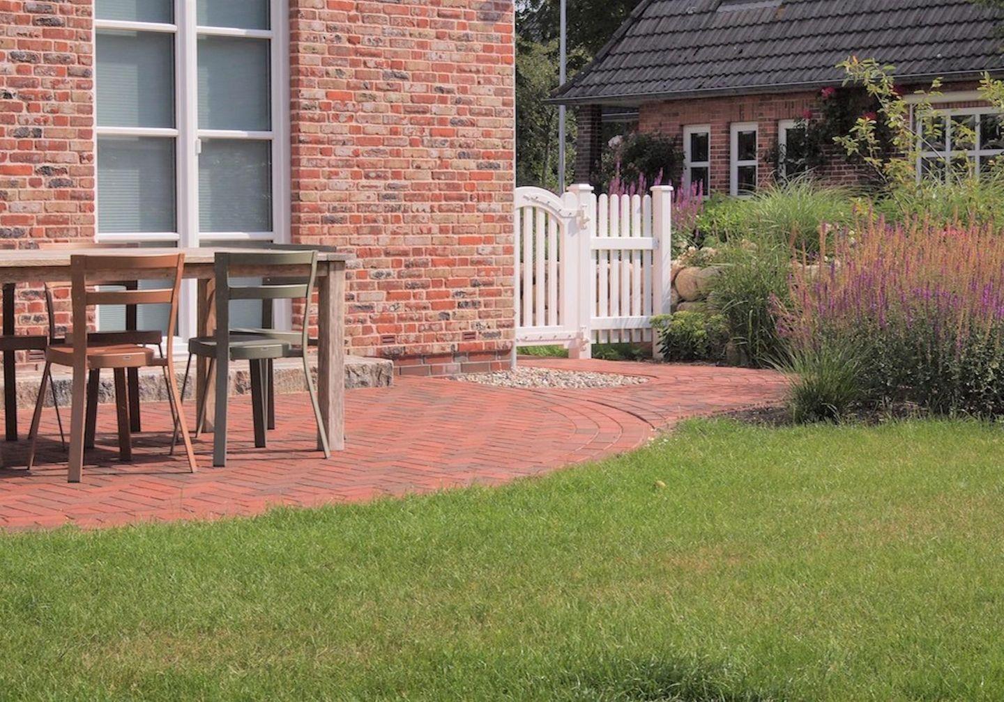 Das Grundstück mit Carport, Stellplatz, großer Rasenfläche und einer geschützten, sonnigen Terrassen ist mit heimischen Pflanzen und einem Friesenwall angelegt.