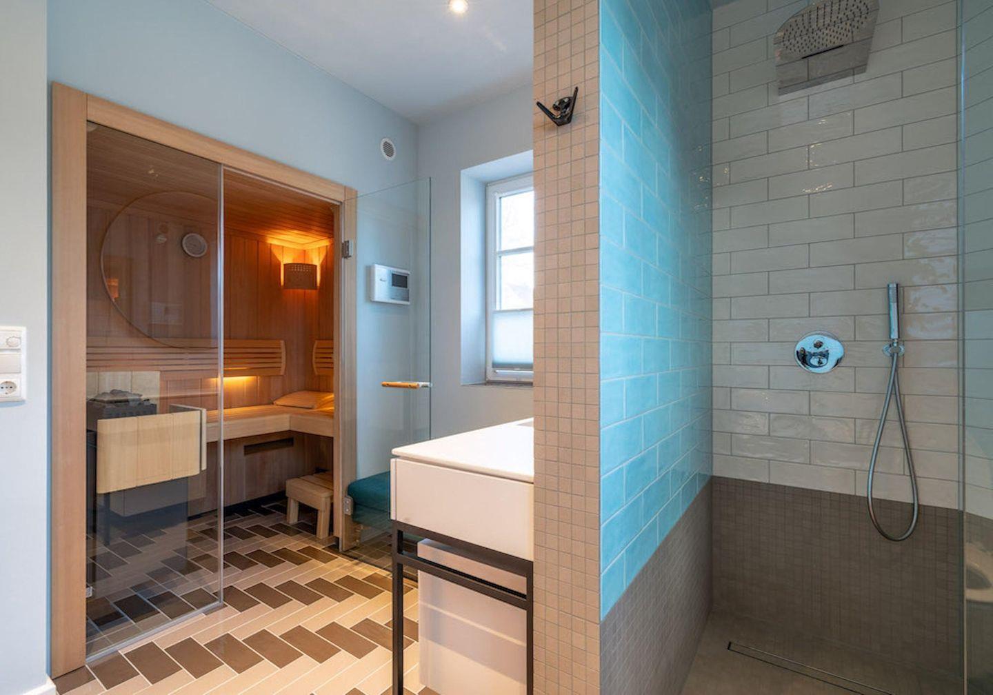 Im Erdgeschoss befindet sich der lichtdurchflutete Wohnraum mit TV, einer großen offenen Küche sowie einem stilvollen Essbereich. Die Wohnräume sind mit exklusiven Möbeln ausgestattet. Die Küche verfügt über hochwertige Elektrogeräte. An den Wohnbereich schließen sich ein Duschbad mit Sauna, ein Hauswirtschaftsraum und ein geräumiger Flur. Das gesamte Erdgeschoss verfügt über geschmackvolle Fußbodenfliesen und Dielenboden. Für ein wohliges Klima sort im ganzen Haus eine Fußbodenheizung.