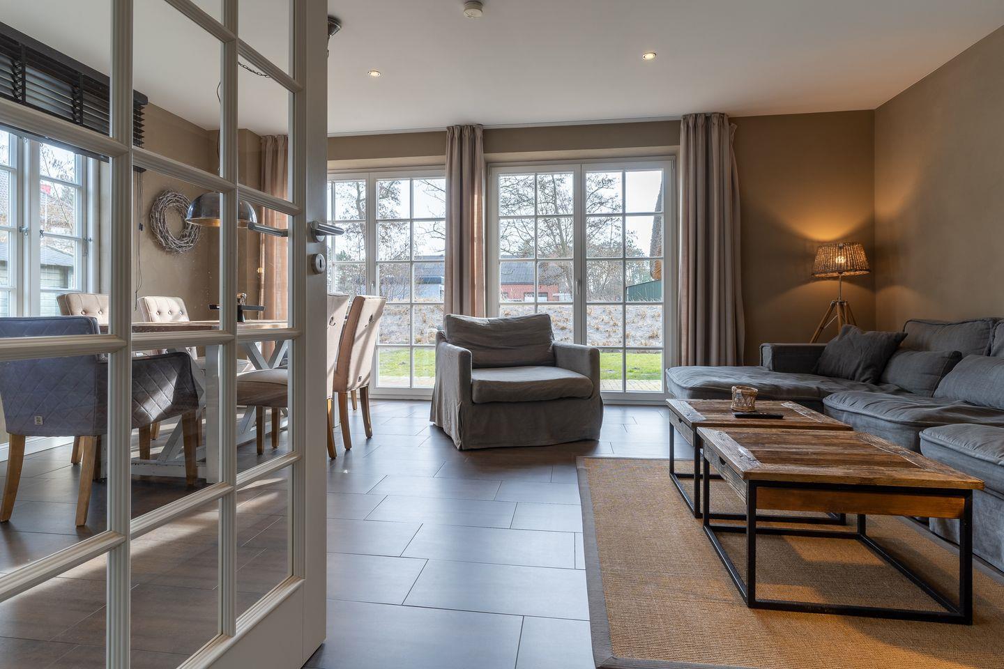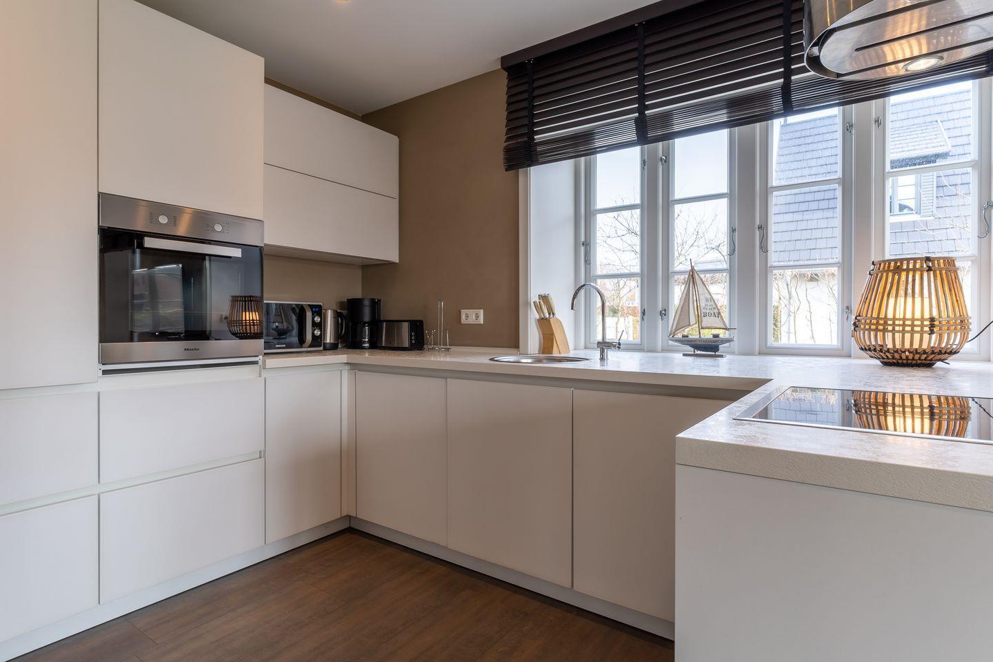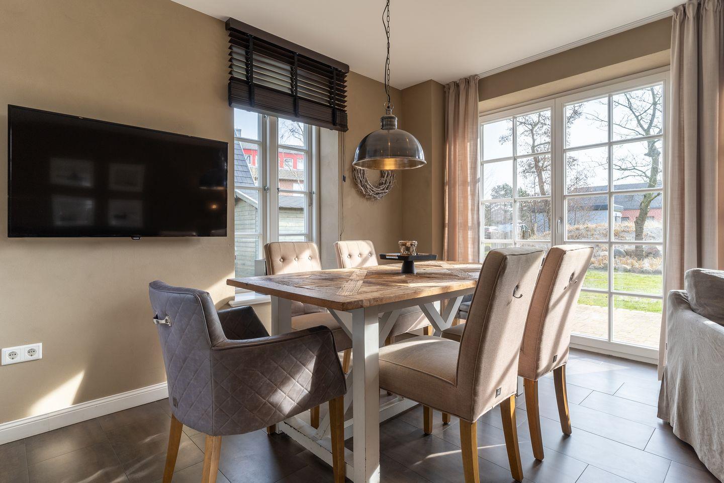 Die luxuriöse Haushälfte unter Reet verfügt über ca. 108 m² Wohnfläche und bietet Platz für 6 Personen. Im Erdgeschoss befindet sich der lichtdurchflutete Wohnraum mit TV, Kamin, einer offenen Küche sowie einem stilvollen Essbereich. Die Wohnräume sind mit exklusiven Möbeln von Riviera Maison ausgestattet. Die Küche verfügt über hochwertige Elektrogeräte. An den Wohnbereich schließen sich ein Flur mit eingebauter Garderobe, ein Hauswirtschaftsraum und ein Duschbad an. Das gesamte Erdgeschoss verfügt über geschmackvolle Fußbodenfliesen, die über eine Fußbodenheizung (Erdwärme) beheizt werden können.