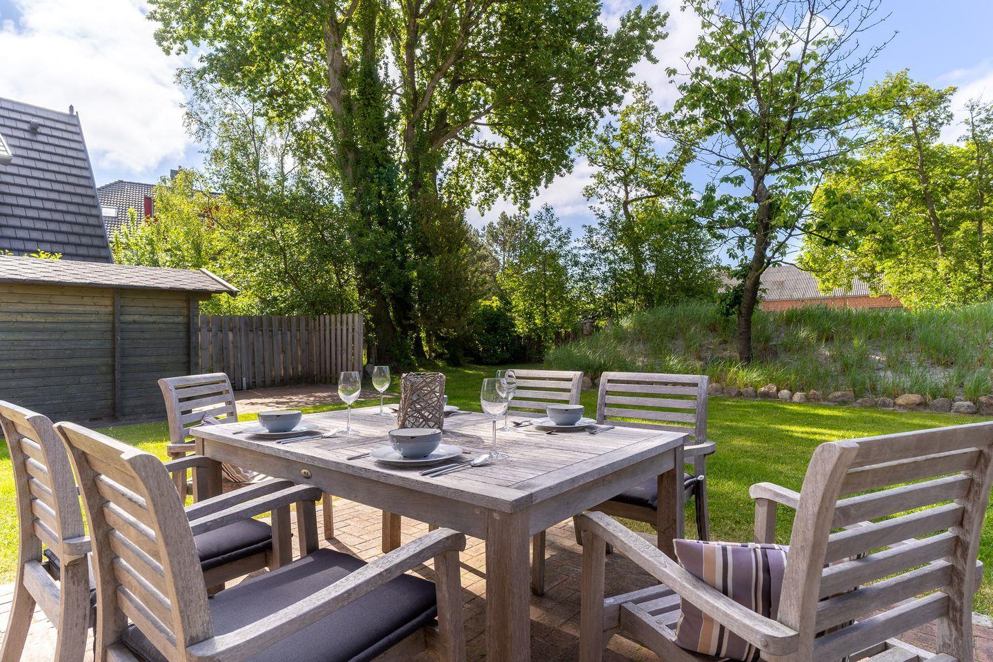Zu dem Ferienhaus gehört ein Parkplatz für ein Auto. Das Grundstück verfügt über eine große Rasenfläche und ist mit einer geschützten, sonnigen Terrasse mit einheimischen Pflanzen und einer Düne angelegt. Aus einem Strandkorb können Sie den Blick auf das Haus oder die Düne genießen.
