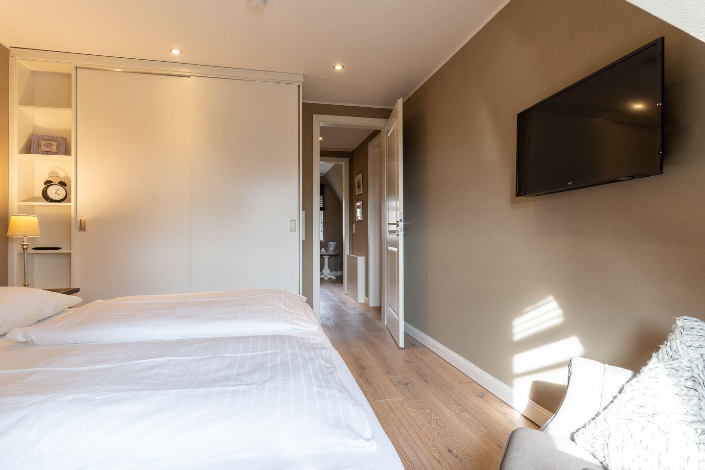 Über eine Holztreppe gelangt man in das mit Parkett ausgelegte Obergeschoss. Dieses verfügt ebenfalls über eine Fußbodenheizung. Die beiden Schlafzimmer, eines mit einem Boxspring-Doppelbett und eines mit 2 Boxspring-Einzelbetten, sind ebenfalls jeweils mit TV ausgestattet. Einbauschränke gewähren Ihnen hinreichend Ablageflächen. Darüber hinaus befindet sich im Obergeschoss ein weiteres, geräumiges Bad mit Dusche und Badewanne. Vom Obergeschoss führt die Holztreppe hinauf in das Dachgeschoss. Hier befindet sich ein zusätzliches Schlafzimmer mit 2 Boxspring-Einzelbetten, die zum Doppelbett zusammen geschoben werden können. Dieses wunderschöne Haus lässt keine Wünsche offen und bringt Sie sofort in Urlaubsstimmung.