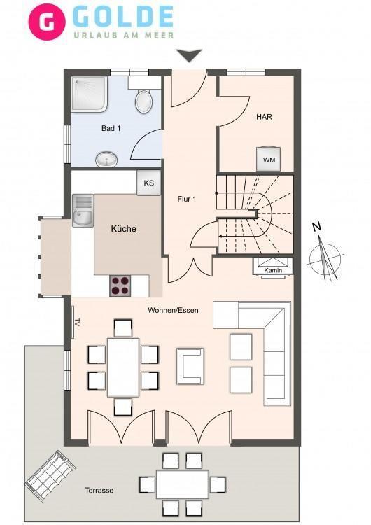 Die luxuriöse Haushälfte unter Reet verfügt über ca. 108 m² Wohnfläche und bietet Platz für 6 Personen. Im Erdgeschoss befindet sich der lichtdurchflutete Wohnraum mit TV, Kamin, einer offenen Küche sowie einem stilvollen Essbereich. Die Wohnräume sind mit exklusiven Möbeln von Riviera Maison ausgestattet. Die Küche verfügt über hochwertige Elektrogeräte. An den Wohnbereich schließen sich ein Flur mit eingebauter Garderobe, ein Hauswirtschaftsraum und ein Duschbad an. Das gesamte Erdgeschoss verfügt über geschmackvolle Fußbodenfliesen, die über eine Fußbodenheizung (Erdwärme) beheizt werden können.