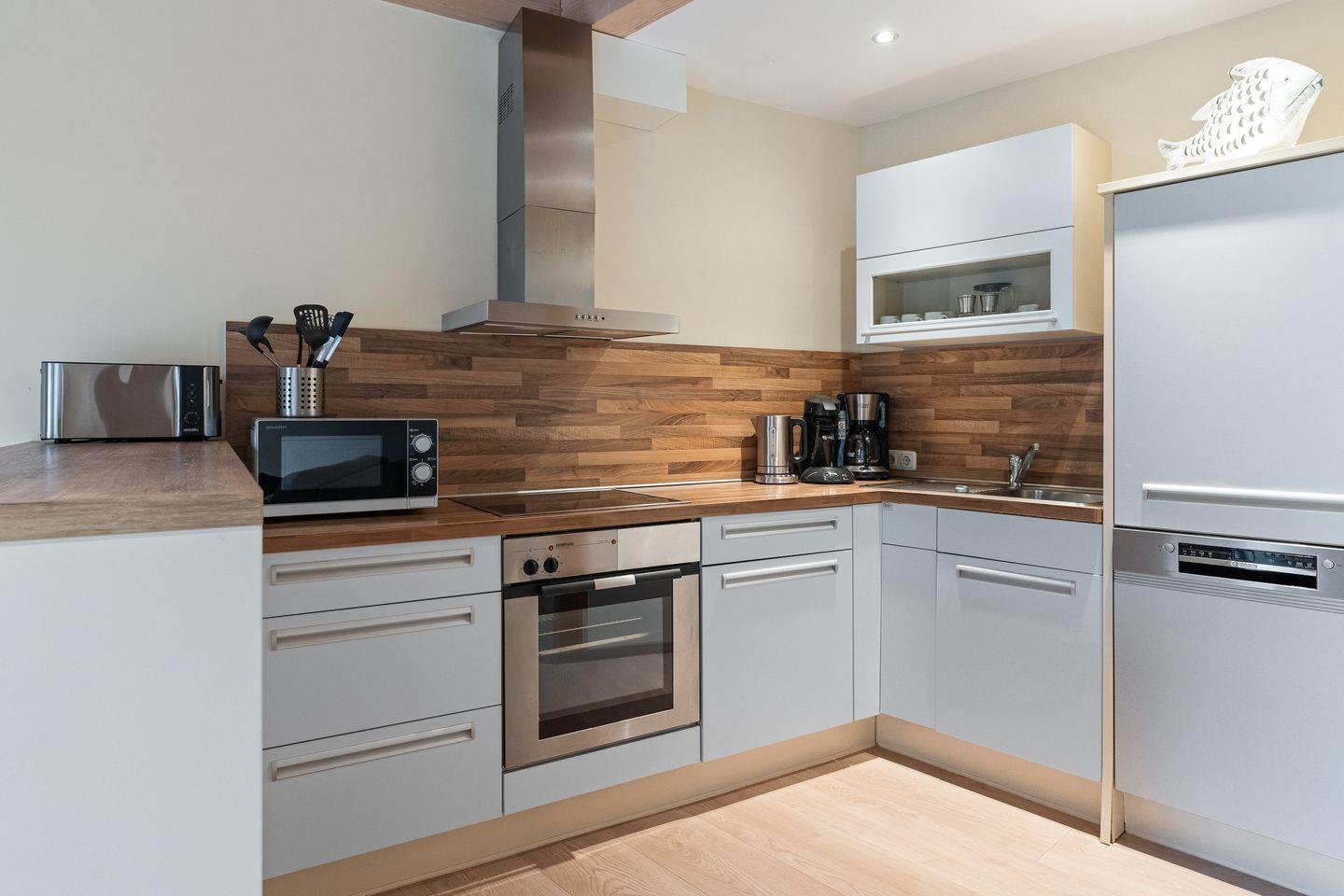 Im Erdgeschoss befindet sich ein großzügiger Wohnraum mit TV und einer modernen Wohnküche. Die Küche verfügt über hochwertige Elektrogeräte, eine Pad-Kaffeemaschine und eine Filter- Kaffeemaschine.