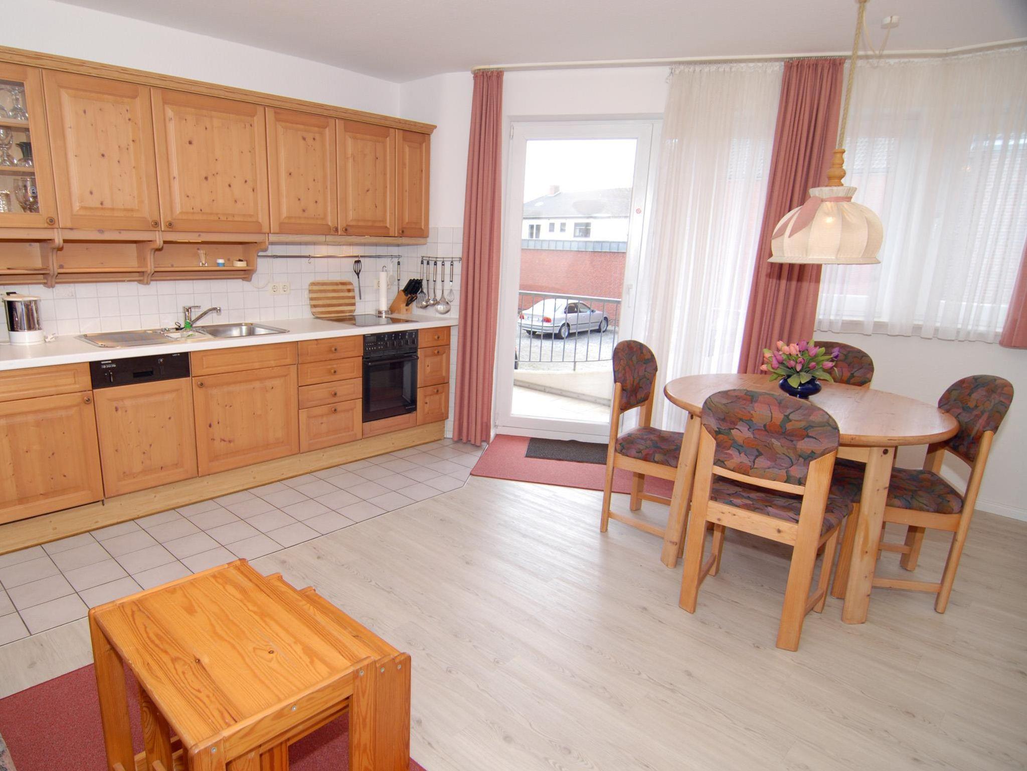 Wohnzimmer: Couch, Couchtisch, Stehlampe, Vitrinenschrank, Kabel-TV, Flachbildschirm, Telefon, Nachtspeicherofen, Kofferradio, Esstisch, 4 Stühle, Spiegel, Küchenzeile, 4 Plattenherd mit Ceranfeld und Backofen, Dunstabzugshaube, Kühlschrank, Spülmaschine, Kaffeemaschine, Toaster, Teekessel, Geschirr, Kochtöpfe