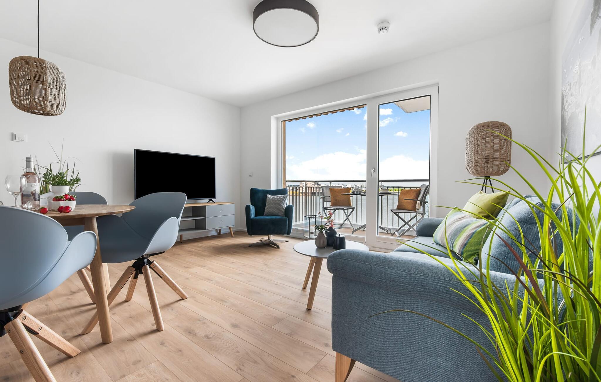 Öppna ytterdörren, kliv in och känn dig helt enkelt som hemma! Blicken faller direkt genom fönstren från golv till tak över balkongen på hamnen och vattnet ända bort till horisonten. TROPEZ på OstseeResort Olpenitz.