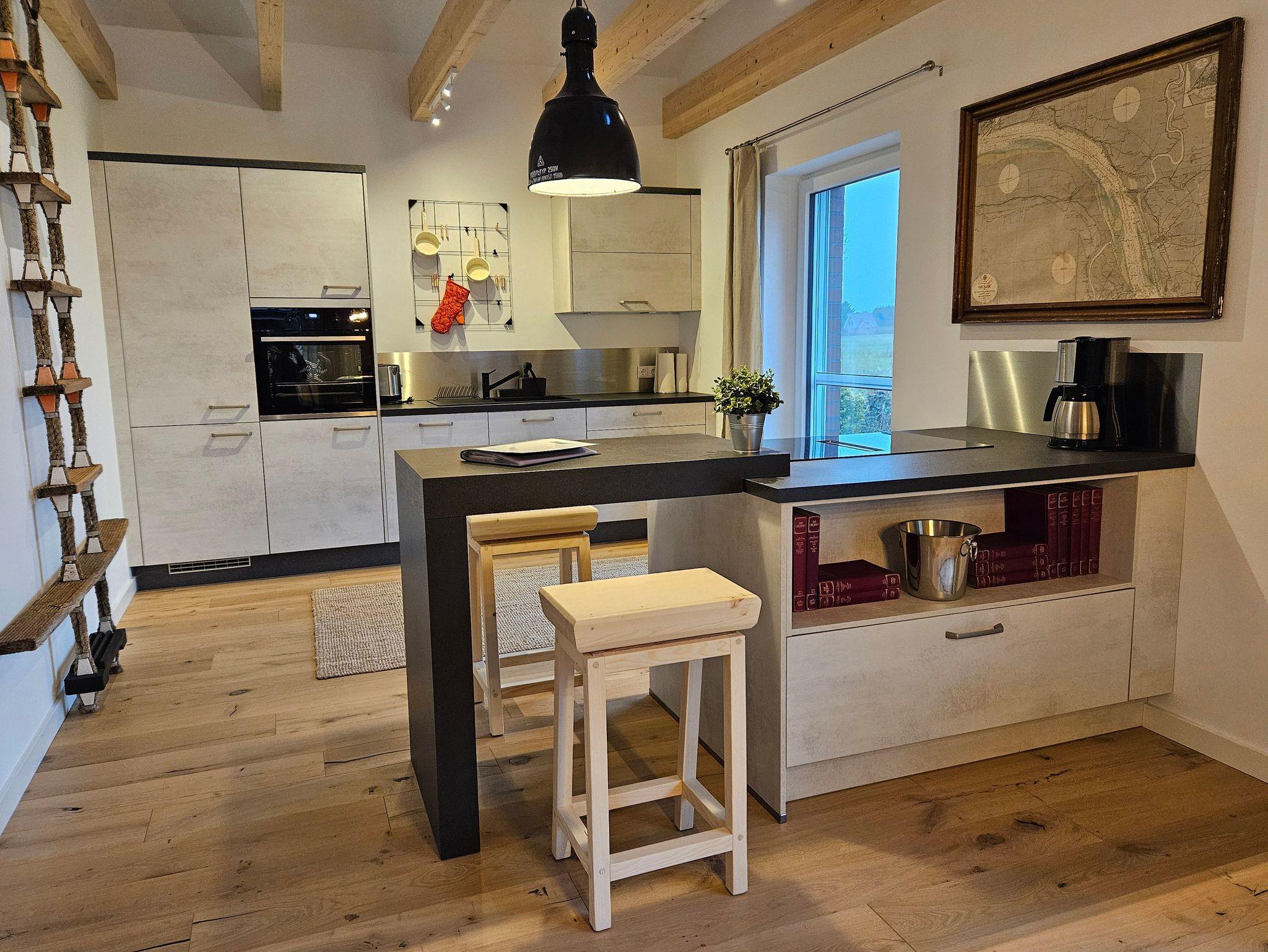 Ganz neu erbautes, freistehendes Ferienhaus auf einem abgeschlossenen Grundstück. Wohnfläche ca. 90 m², zwei separate Schlafzimmer mit jeweils einem Doppelbett (davon einmal Boxspring). Großes Badezimmer mit ebenerdiger Dusche, WC und Waschtisch. Gäste-WC mit Handwaschbecken. Offener Küchenbereich mit Kühlschrank, Gefriereinheit, Geschirrspüler, Backofen, Mikrowelle und Kochinsel mit Induktionsherd und Absaugung, Kaffeemaschine, Wasserkocher, Toaster usw. Angrenzender Wohn- und Essbereich mit (Schlaf-) Couch, großem Esstisch, SAT-TV und W-LAN im ganzen Haus. Sonnenterrasse mit Gartenmöbeln, Sonnenschirm und Grillmöglichkeit. Zwei PKW-Stellplätze und verschließbarer Abstellraum für Fahrräder.