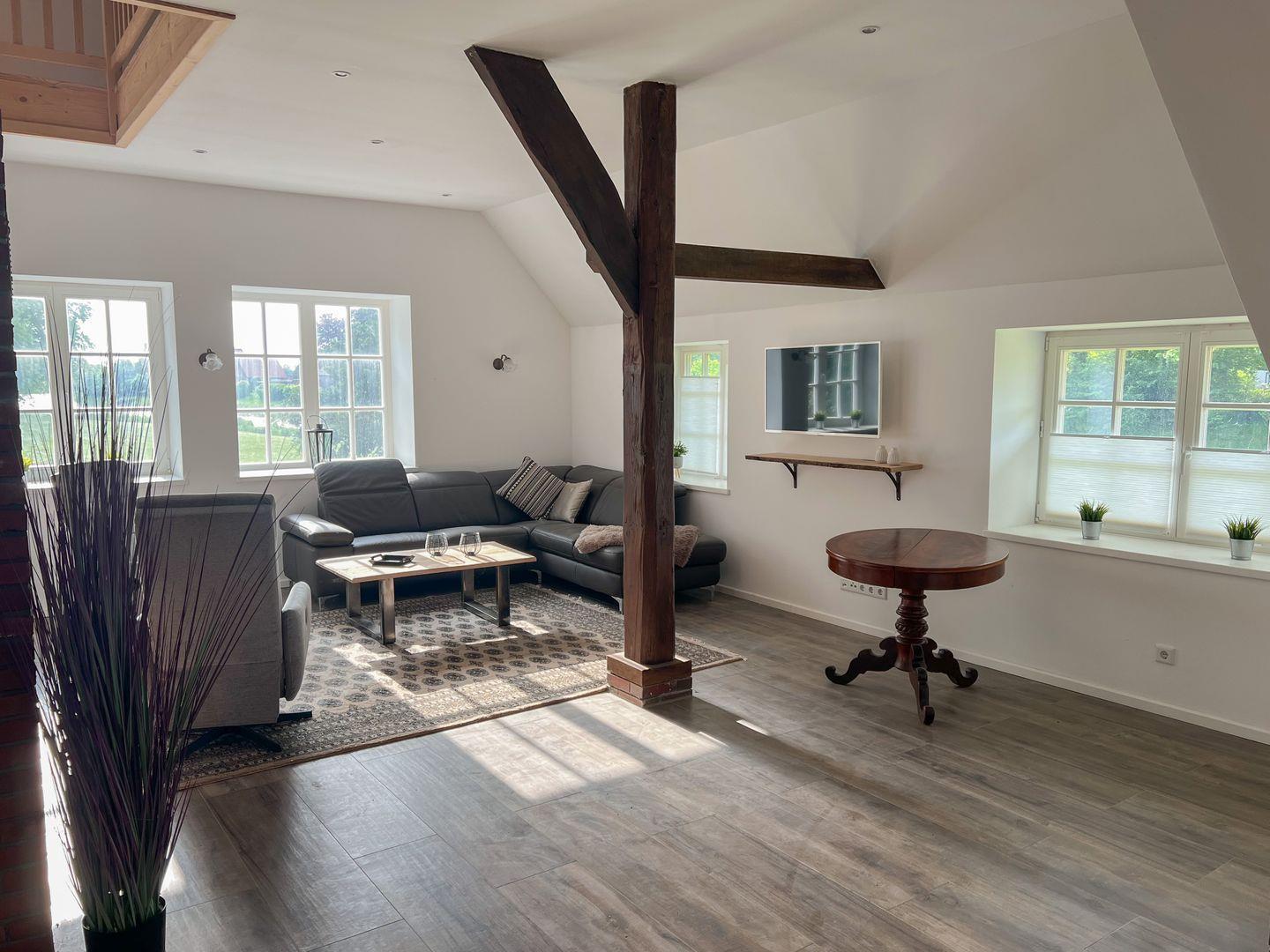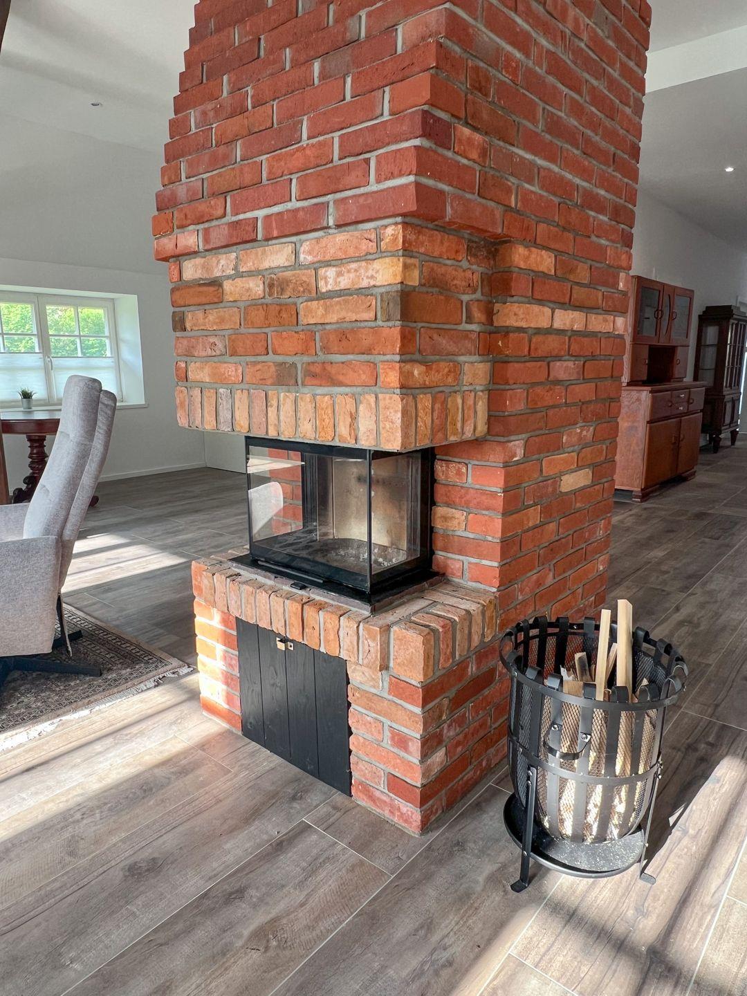 Das Wohnzimmer lädt mit einem gemütlichen Sofa, Kaminofen und direktem Gartenzugang zum Entspannen ein. An kühleren Tagen sorgt der Ofen für wohlige Wärme, während du es dir mit einem Buch oder Film bequem machst. Die offene Küche ist voll ausgestattet und bietet alles für gemeinsame Kochabende – inklusive Geschirrspüler und Esstisch.