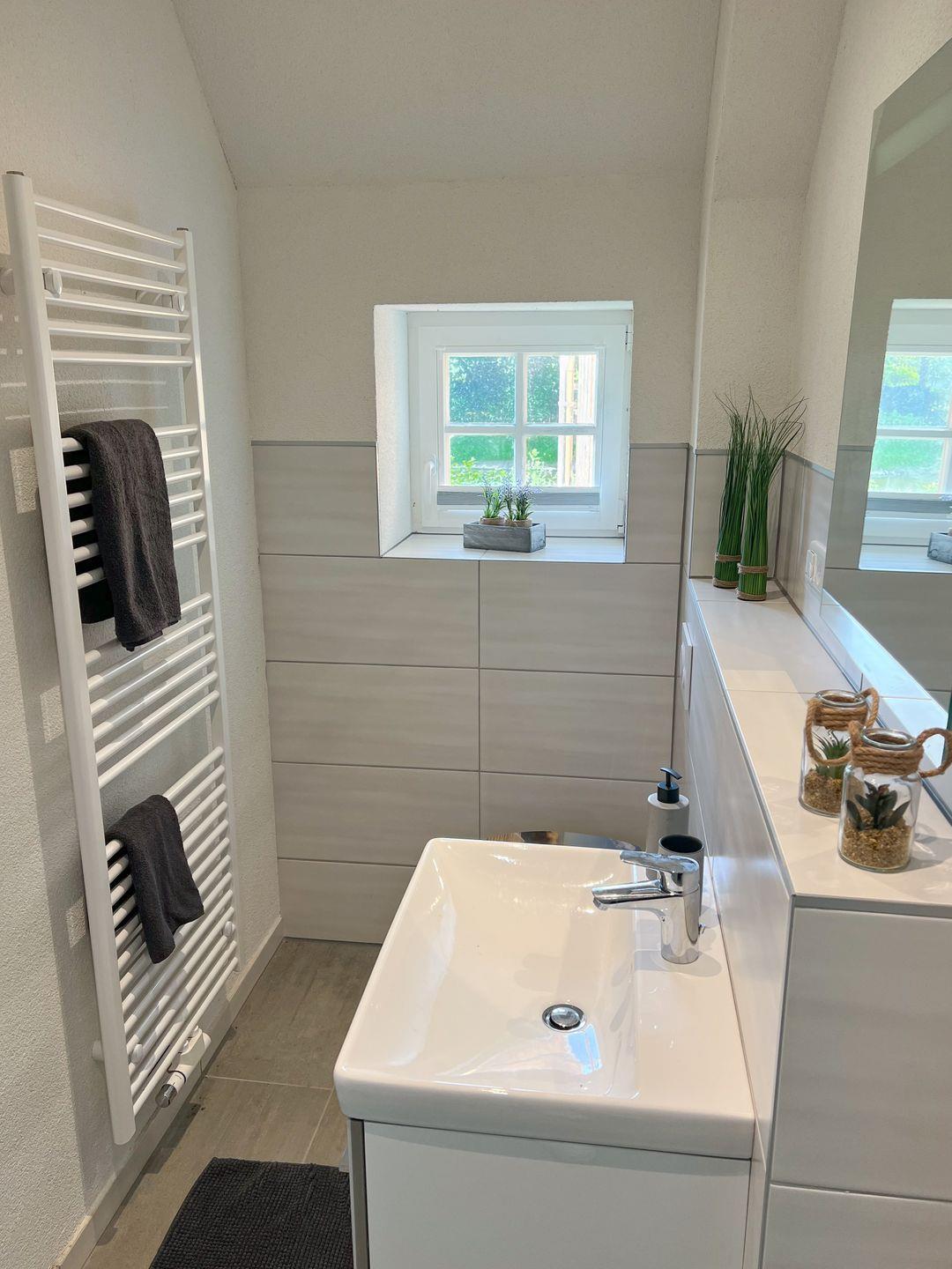 Im modernen Bad erwartet dich eine ebenerdige Dusche, eine Fußbodenheizung – perfekt, um nach einem Ausflug in die Nordseeluft zu entspannen.