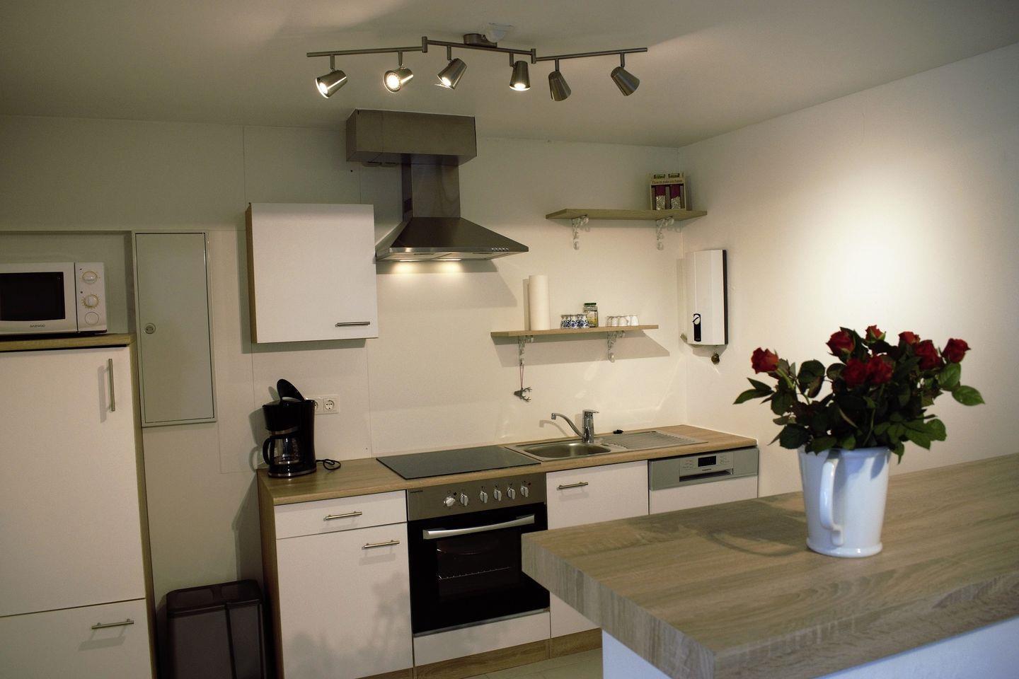 Die Wohnung ist mit einer komfortablen Sofaecke ausgestattet, die zum Entspannen einlädt und einen weiteren Schlafplatz bietet. Ein Esstisch im großzügigen Essbereich schafft die perfekte Atmosphäre für gesellige Abende, während Sie in der gut ausgestatteten Küche alle Annehmlichkeiten vorfinden, die Sie für die Zubereitung Ihrer Mahlzeiten benötigen. Zu den Küchengeräten gehören ein Herd, ein Elektro-Backofen, eine Spülmaschine, sowie Mikrowelle und Kühlschrank mit Gefrierfach. Weitere nützliche Utensilien sind selbstverständlich ebenfalls vorhanden.