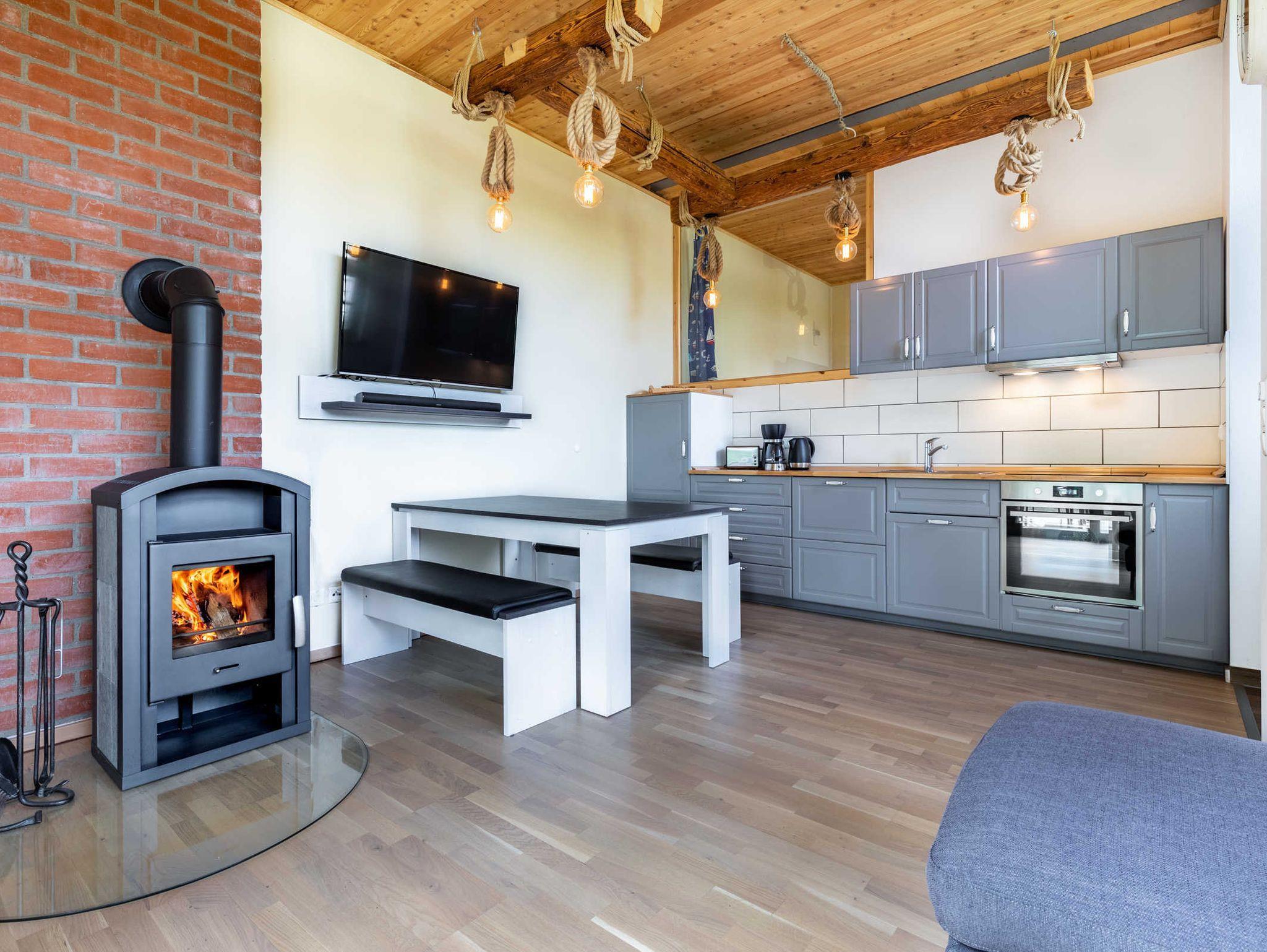 Aus dem Wohnzimmer gelangt man direkt auf die Holzterrasse mit Grill und in den Garten. Der urige Kamin sorgt für warme und stimmungsvolle Abende an kühleren Tagen. Für ausreichend Kaminholz ist gesorgt.