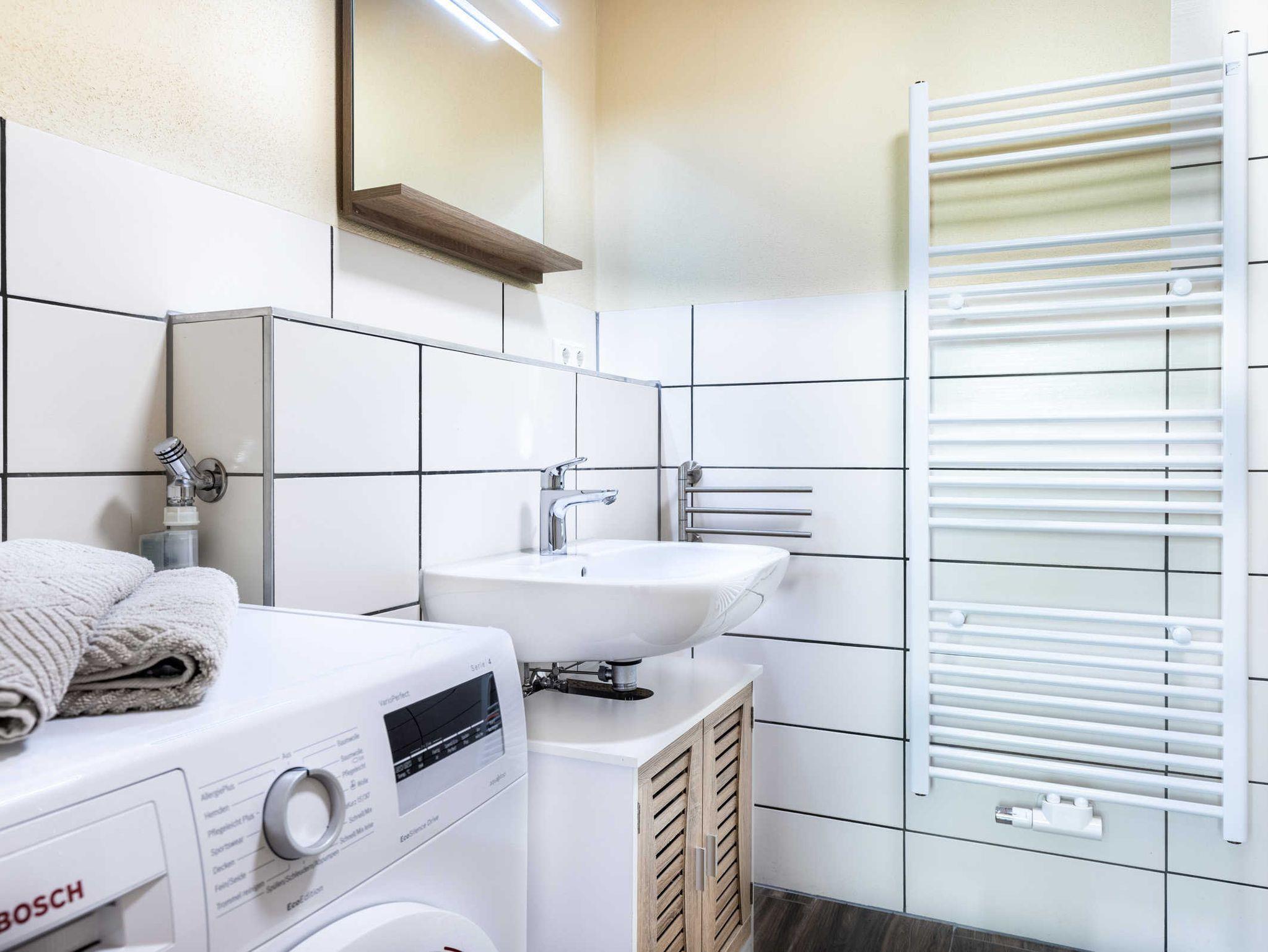 Bad mit Dusche, Waschbecken und Waschmaschine. Separates WC mit Waschbecken.