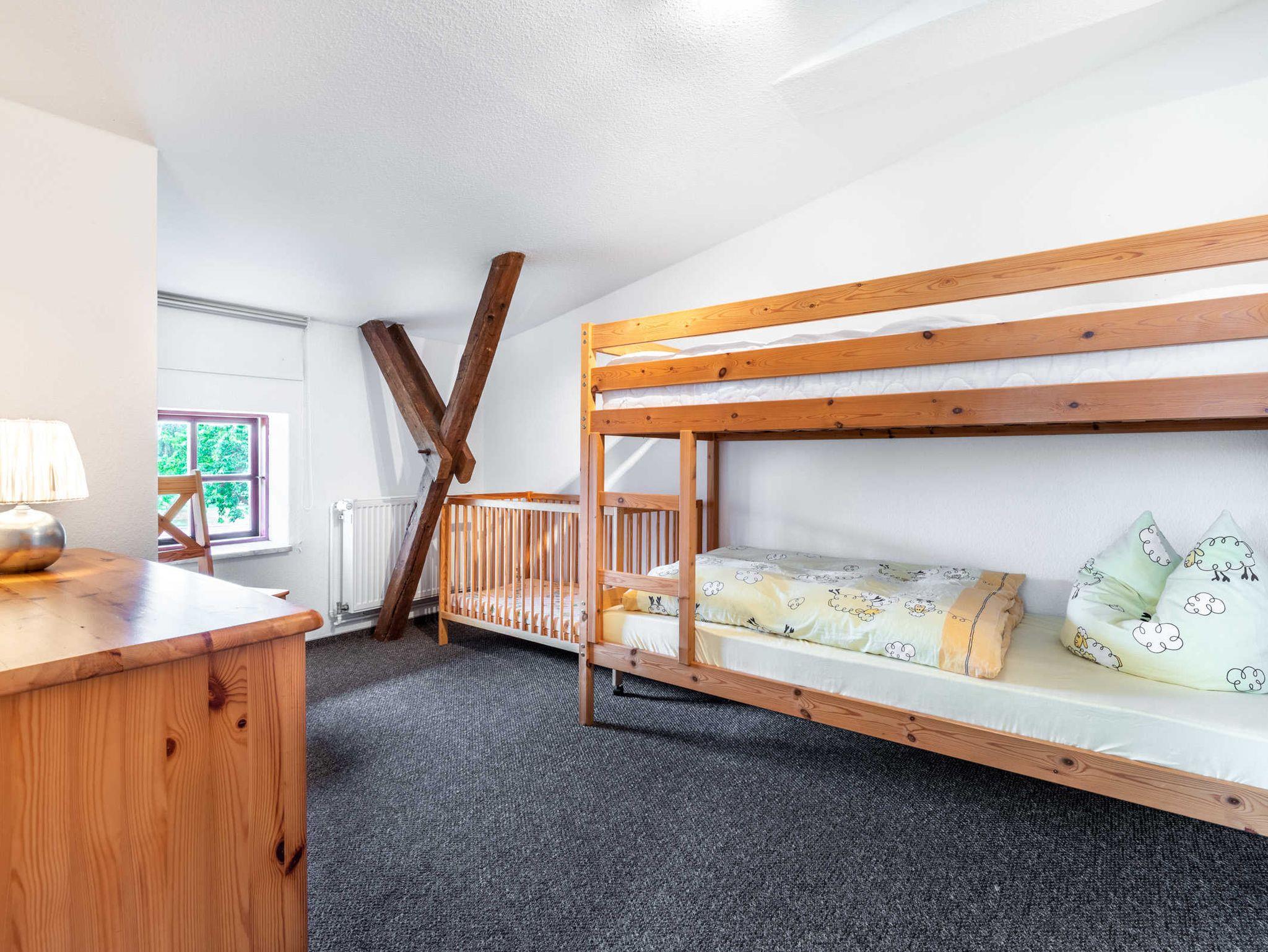 Oberer Bereich: zwei getrennte Schlafzimmer. Schlafzimmer 1 mit Doppelbett, Kinderbettchen und Kleiderschrank. Schlafzimmer 2 mit Etagenbett und Kommode.