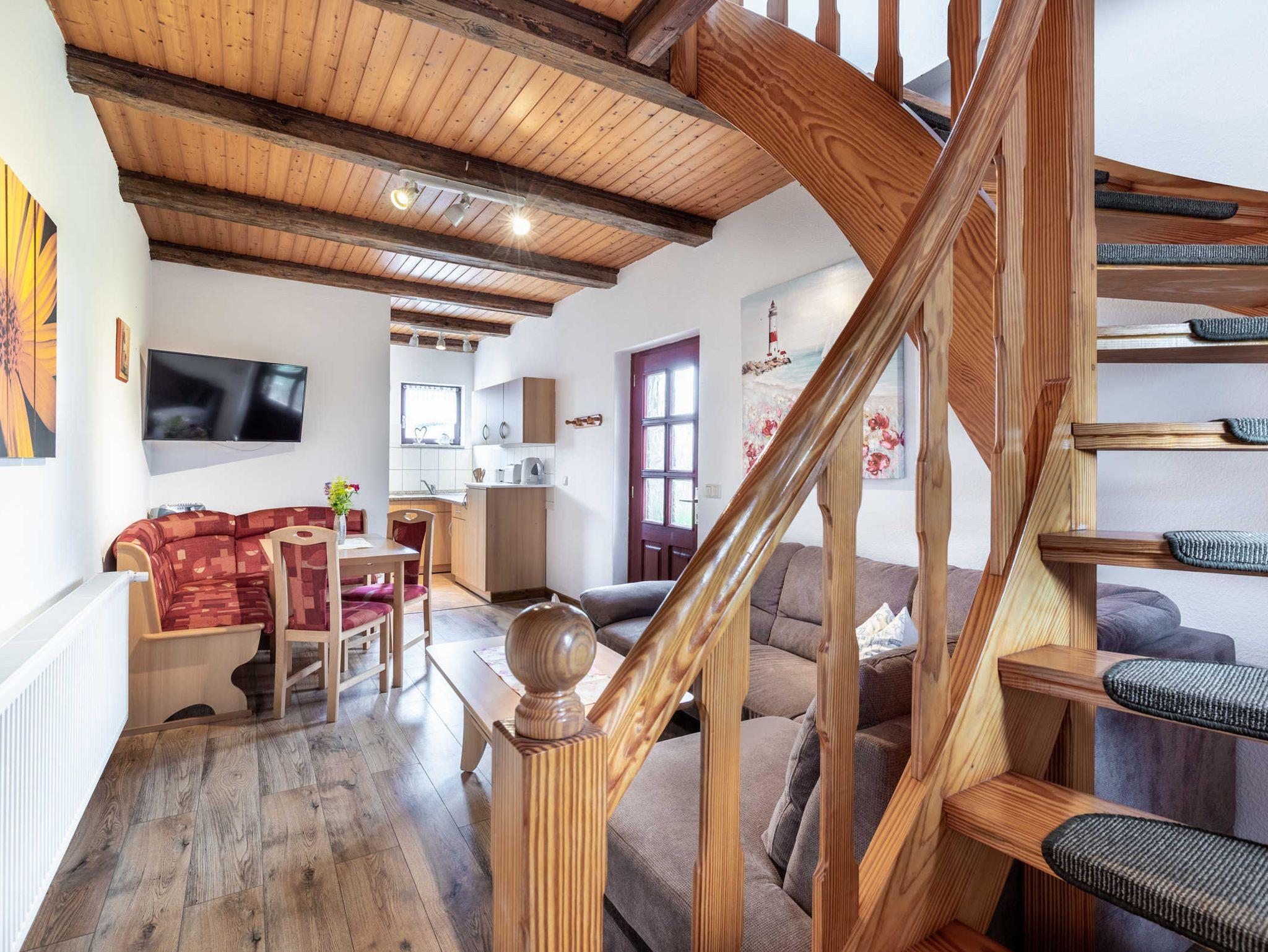 Unterer Bereich: Wohnzimmer mit gemütlichem Sitzbereich und TV, Küchenecke mit Kaffeemaschine,2- Platten- Herd, Mini Backofen, Toaster, Wasserkocher und Esstisch. Bad mit Dusche und WC