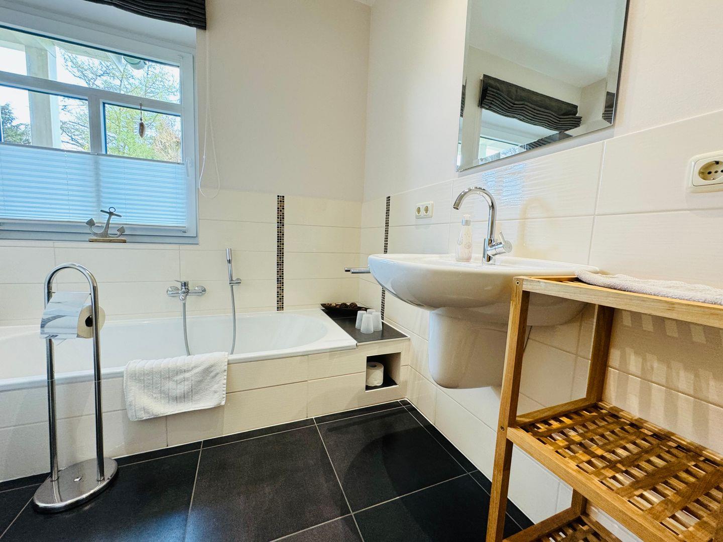 Im Badezimmer erwartet Sie eine ebenerdige Dusche mit Glasabtrennung, eine Badewanne, WC, Haartrockner, Spiegel und Waschbecken. Zur Unterhaltung stehen ein Fernseher mit SAT-Empfang, Radio, CD-Player, Bücher und Spiele sowie WLAN zur Verfügung. Die Ausstattung umfasst zudem eine Waschmaschine, Bügeleisen, Bügelbrett, Kinderhochstuhl, Kinderspielzeug, Steckdosensicherung, Wickelauflage und Zentralstaubsauger.