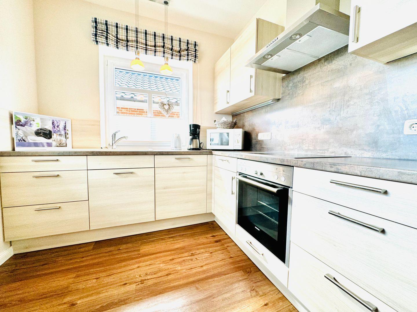 Die offene Küche ist voll ausgestattet mit Mikrowelle, Ceran-Kochfeld, Backofen, Kühlschrank mit Gefrierfach, Spülmaschine, Kaffeemaschine, Wasserkocher, Toaster, Mixer sowie Geschirr und Besteck.
