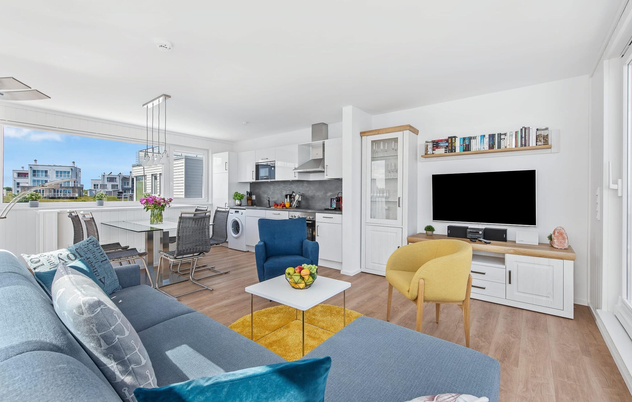 Det ljusa och öppna vardagsrummet med matplats ligger på det övre planet. I det moderna och välutrustade köket med matplats kan man tillaga läckra semestermåltider. Medan fönster från golv till tak ger en fenomenal panoramautsikt, inbjuder den angränsande terrassen dig att njuta av den friska Östersjöbrisen.