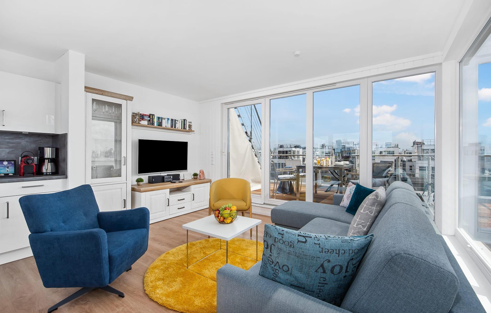 Från denna terrass leder en utvändig trappa upp till den 30 m2 stora takterrassen med solsken hela dagen och panoramautsikt över marinan, floden Schlei och dess mynning i Östersjön. Strandstolen inbjuder dig att tillbringa mysiga timmar i solen eller läsa.