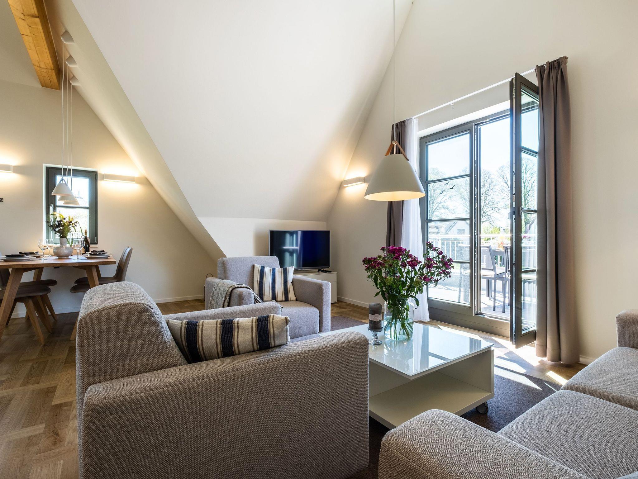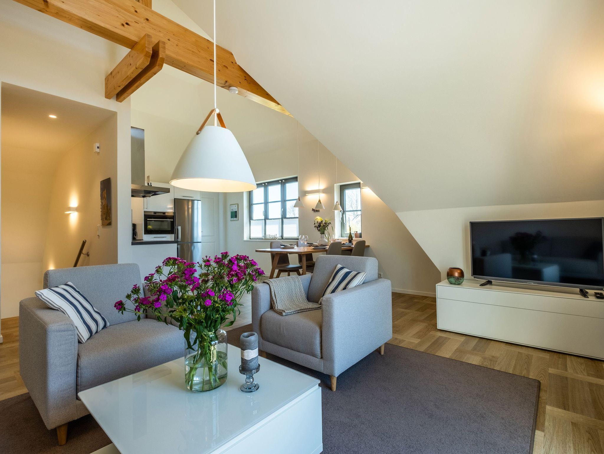 Die moderne und helle Ferienwohnung ist hochwertig ausgestattet. Sie verfügt über eine komplett eingerichtete Einbauküche mit Spülmaschine, Mikrowelle, Induktionsherd und großem Kühlraum mit separatem Gefrierabteil sowie Kaffeemaschine, Wasserkocher und Toaster. Ebenfalls verfügt die Wohnung über eine Waschmaschine. Der Wohnraum ist durch die ca. vier Meter hohe offene Decke geprägt und die fast 12m² große Dachterrasse bietet einen weiten Blick über die Felder, auf das Haff und Wasser. Das große Tageslichtbad ist mit einer bodentiefen Dusche mit Glasabtrennung ausgestattet. Das Hauptschlafzimmer verfügt über ein Doppelbett und das zweite Schlafzimmer über zwei Einzelbetten. Bei allen Betten handelt es sich um Boxspringbetten. Im Wohnzimmer, sowie in einem Schlafzimmer befinden sich jeweils ein Flachbildfernseher.