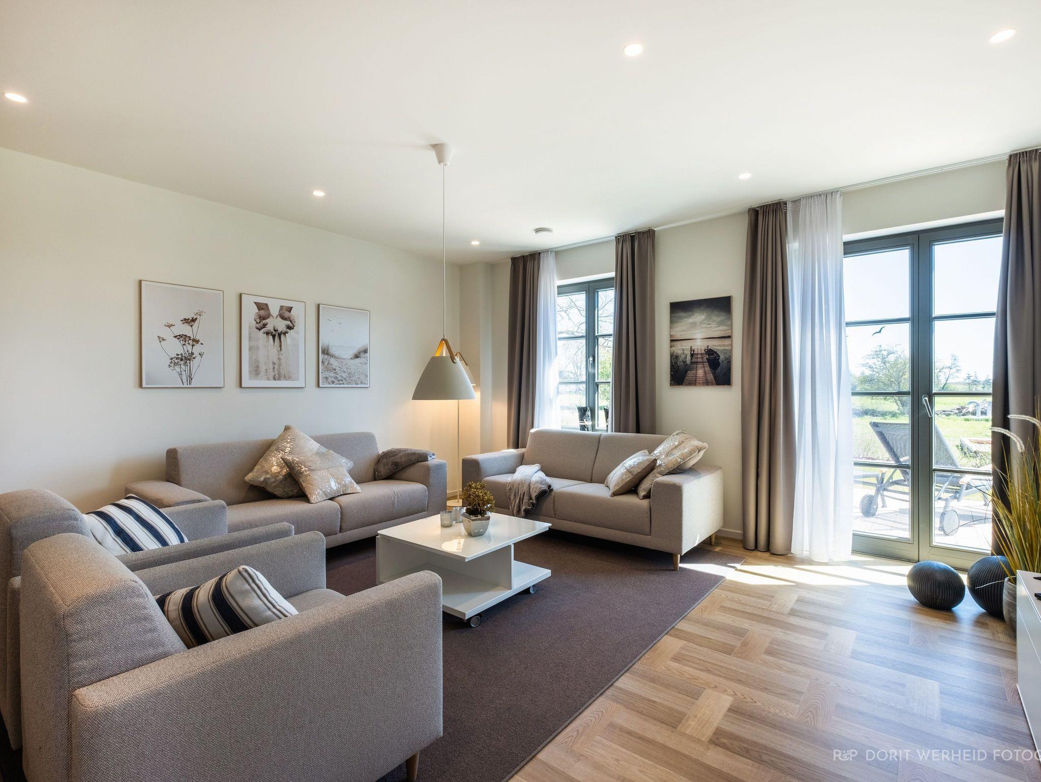 Das sehr hochwertig ausgestattete Ferienhaus verfügt über eine komplette eingerichtete Einbauküche mit Spülmaschine, Mikrowelle, Induktionsherd, großem Kühlschrank mit separatem Gefrierabteil und Kaffeemaschine sowie Wasserkocher und Toaster. Ebenfalls verfügt das Haus über eine Waschmaschine und einen Wäschetrockner. Der Wohnraum bietet durch die großzügige Verglasung einen weiten Blick über die Felder und das Haff. Es gibt zwei Terrassen (30m²) und einen großen Garten. Die drei großen Bäder verfügen jeweils über eine bodentiefe Dusche mit Glastrennung. Eines der Bäder ist zusätzlich mit einer Kombisauna (Ofen und Infrarot) ausgestattet.