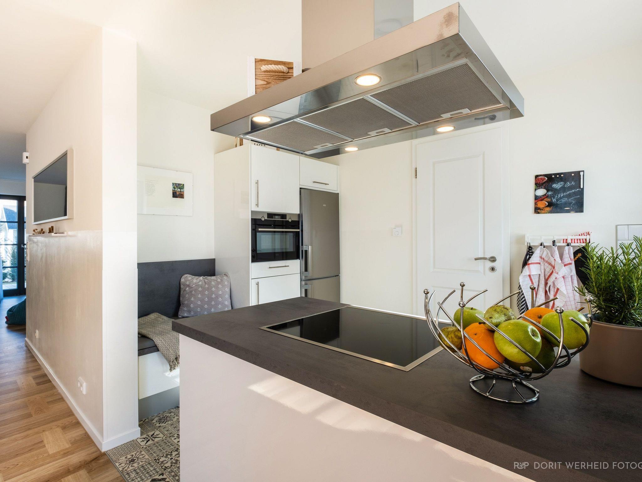 Es teilt sich im Erdgeschoss auf in einen großzügigen Wohn- und Essbereich mit offener Küchenzeile. Die Küche ist ausgestattet mit Induktionsherd, Backofen, Mikrowelle, große Kühl-Gefrierkombination, Spülmaschine, Wasserkocher, Kaffeemaschine und Toaster.