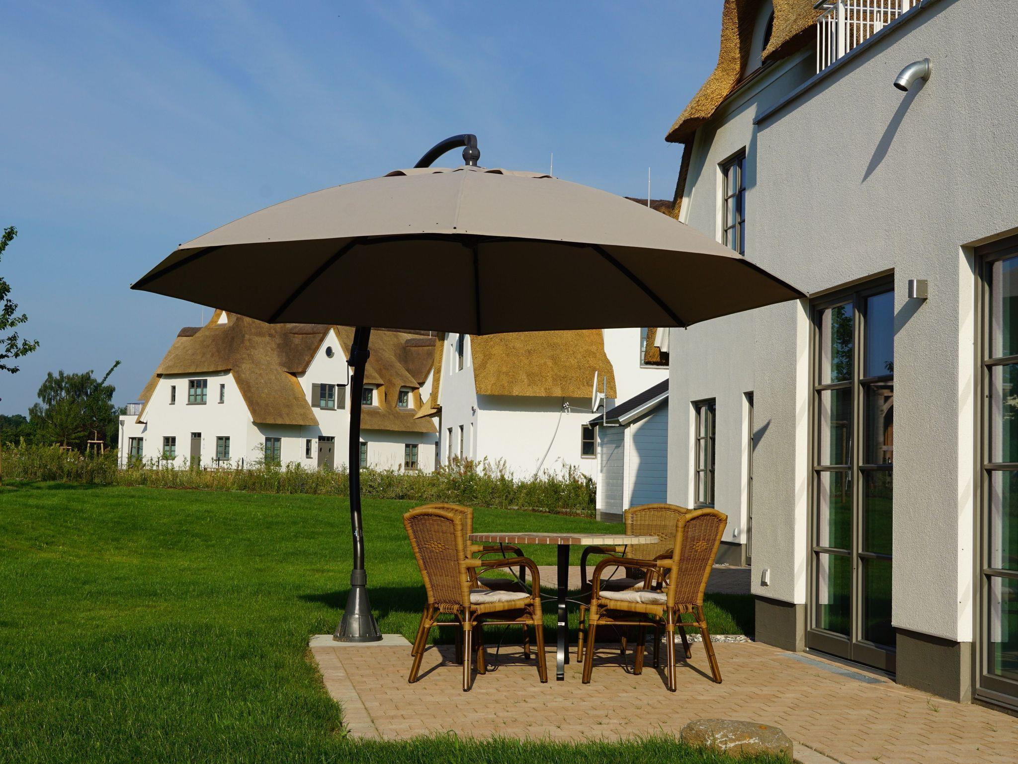 Vom Wohnbereich aus gelangen Sie auf die beiden Terrassen welche mit Terrassentisch und Stühlen, 2 Sonnenliegen und einem großen Ampelschirm zu schönen Stunden im Freien einladen. Im abschließbaren Fahrradabstellraum befindet sich ein Grillwagen, welcher gern genutzt werden darf.