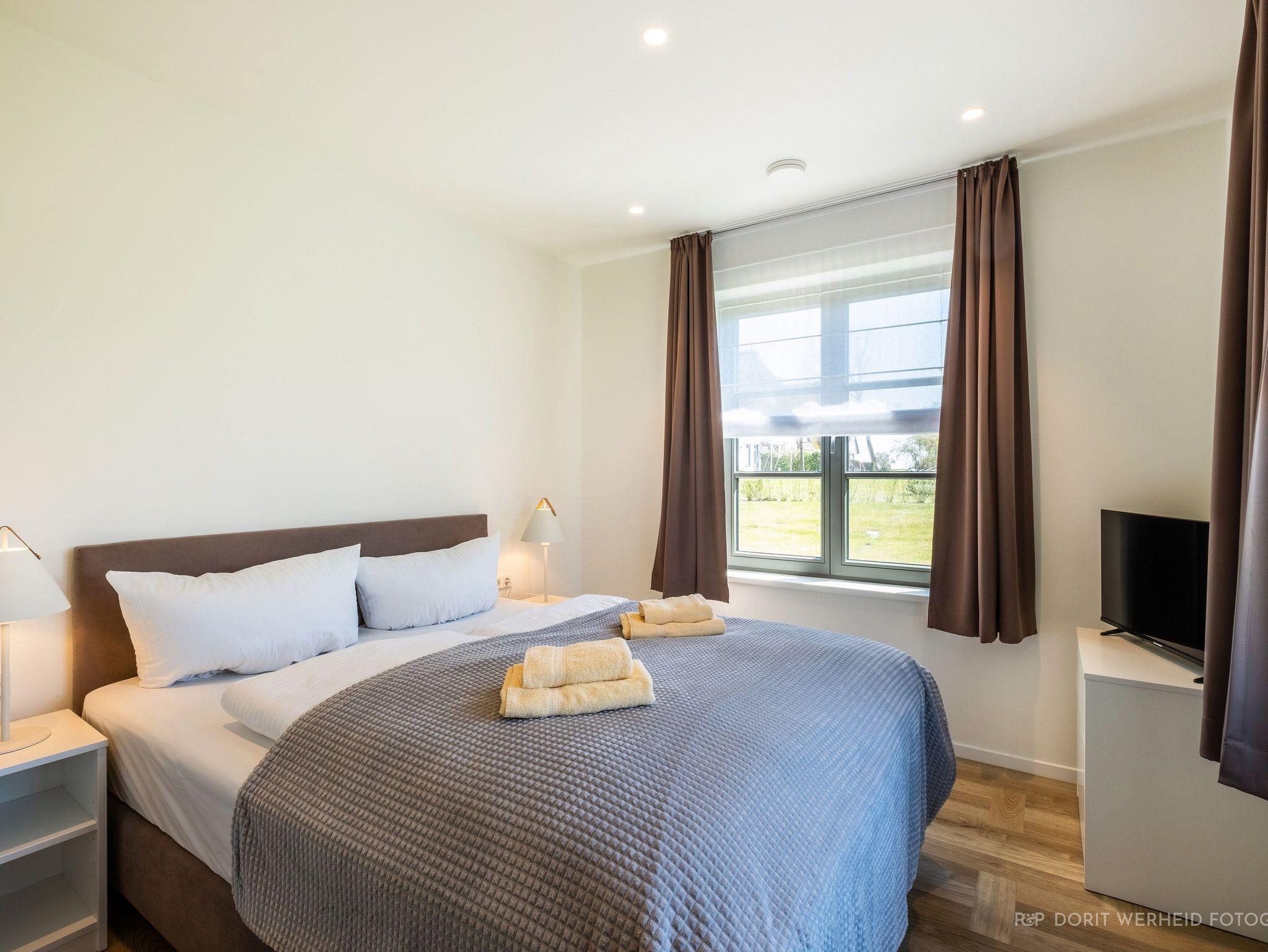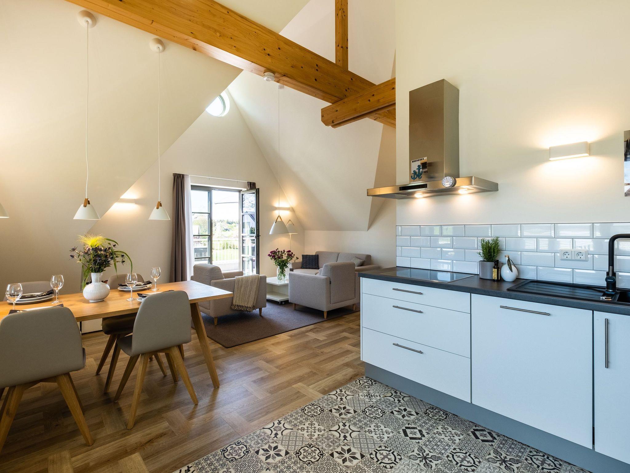 Ebenfalls verfügt die Wohnung über eine Waschmaschine. Der Wohnraum ist durch die ca. vier Meter hohe offene Decke geprägt und die fast 12 qm große Dachterrasse bietet einen weiten Blick über die Felder auf das Haff und das Wasser. Das große Tageslichtbad ist mit einer bodentiefen Dusche mit Glasabtrennung ausgestattet. Das Hauptschlafzimmer verfügt über ein Doppelbett und das zweite Schlafzimmer über zwei Einzelbetten. Bei allen Betten handelt es sich um Boxspringbetten. Im Wohnzimmer, sowie in einem Schlafzimmer befindet sich jeweils ein Flachbildschirm. Kinderreisebett sowie Hochstuhl können nach Verfügbarkeit bei der Verwalterin telefonisch gegen Gebühr bestellt werden.