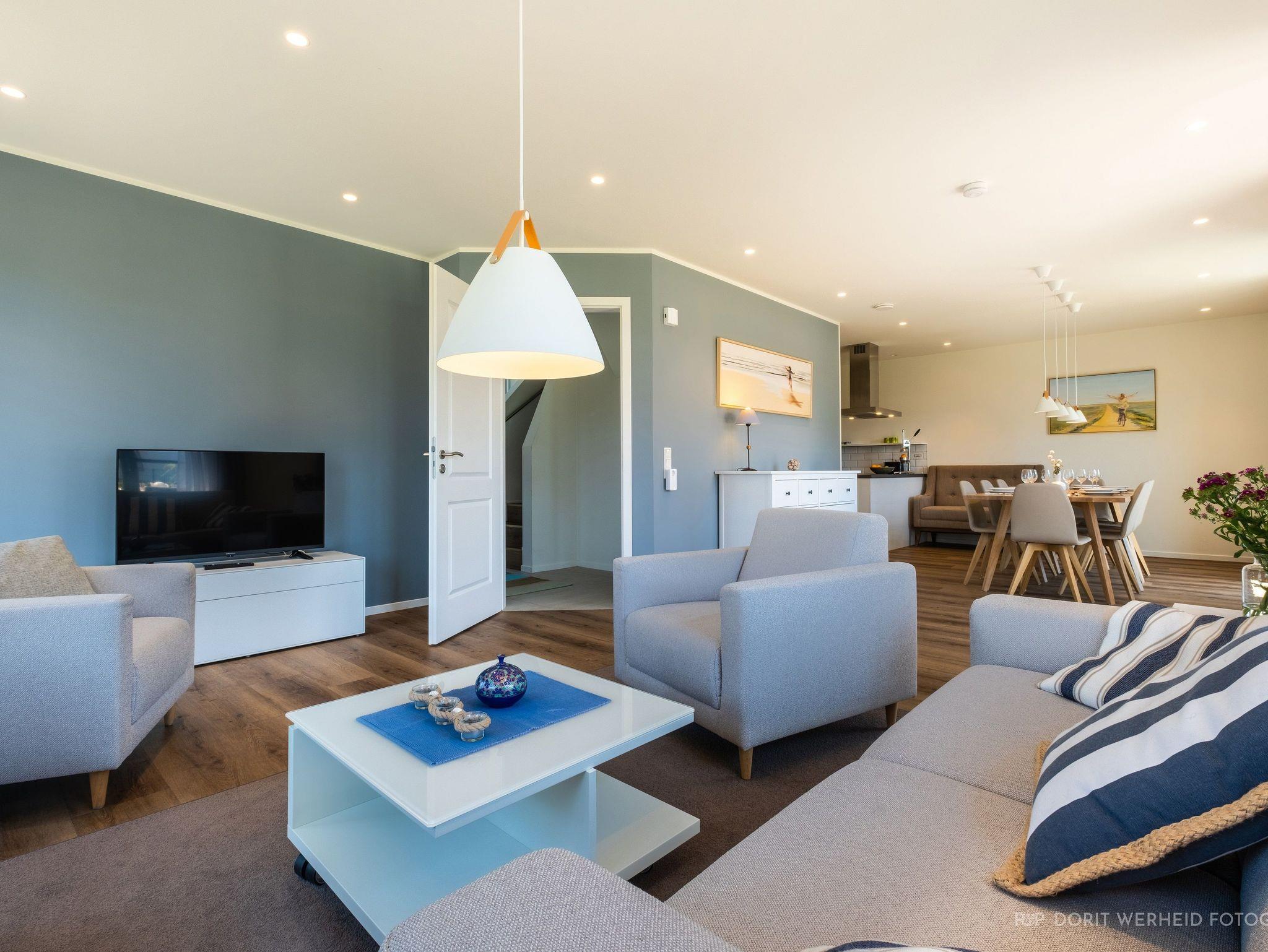 Der großzügige Wohnraum lädt zum Verweilen ein. Hier findest du ein bequemes 3-Sitzer-Sofa, einen Flachbild-TV für entspannte Abende und einen Esstisch, der Platz für bis zu 8 Personen bietet, perfekt für gemeinsame Mahlzeiten und gesellige Stunden. Die moderne Küche ist offen gestaltet und verfügt über ein Cerankochfeld, Backofen, einen Kombi-Gefrierschrank, eine Spülmaschine, eine Kapsel-Kaffeemaschine, Mikrowelle, Wasserkocher, Toaster und vieles mehr. Von dem Wohnbereich gelangen Sie auf die zwei möblierten Terrassen in südwestlicher Ausrichtung, sie bieten Platz zum Sonnenbaden und Relaxen. Das voll eingezäunte Grundstück sorgt für Privatsphäre und Sicherheit für Ihre Kinder und Vierbeiner.