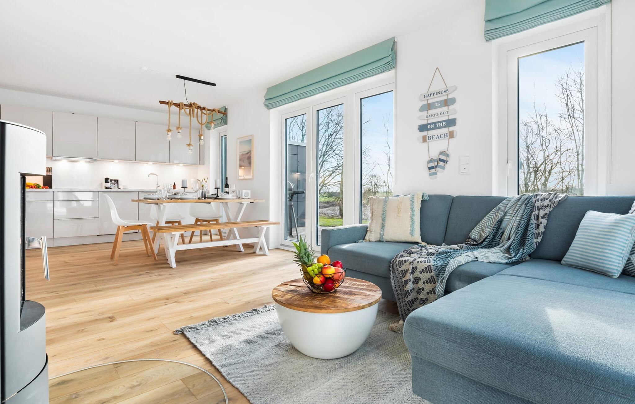 Med fönster från golv till tak och en stor angränsande terrass är det ljusa vardagsrummet med öppen planlösning hjärtat i lägenheten. Kliv in och känn dig omedelbart som om du är på semester - garanterad strandhuskänsla! En mysig soffa i vardagsrummet, en TV och en vedeldad kamin sprider mysig värme och komfort även under mindre soliga dagar. Med utsikt över naturen kan du finna lugn och ro .... Vardagslivet blir mer och mer avkopplande.