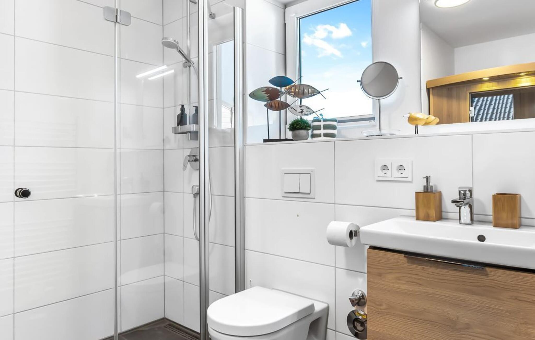 Duschrummet med dusch på golvnivå och en infraröd bastu garanterar oförglömliga hälsostunder som du kan njuta av under en lång tid framöver.