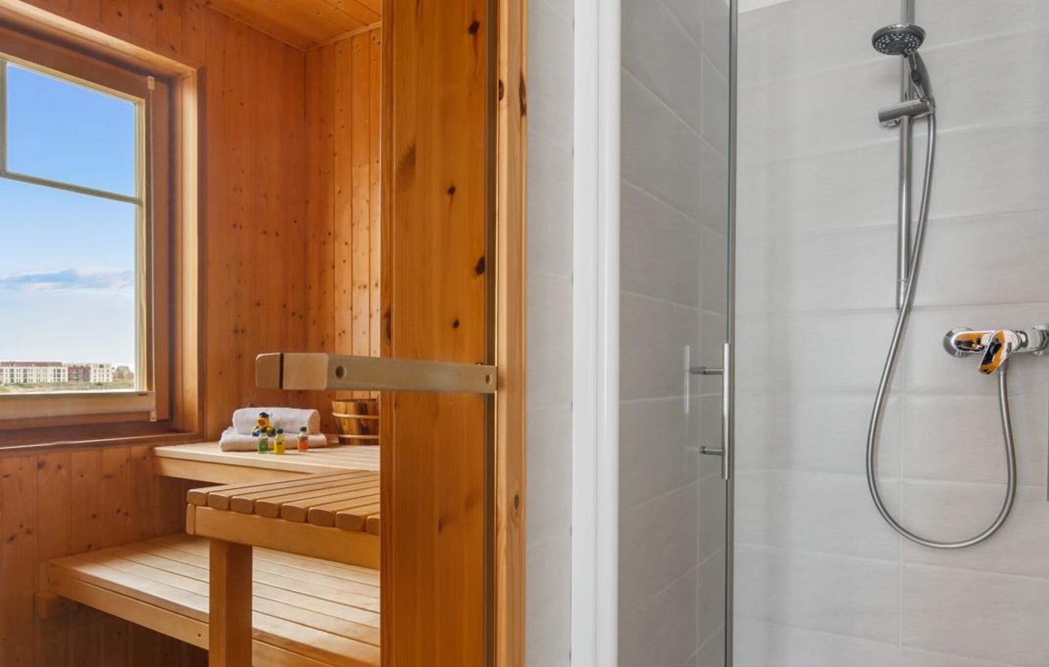 Höjdpunkten i STRANDVILLA är utan tvekan den tredje våningen, som presenterar sig som en privat wellness-oas med en finsk bastu med utsikt över stranden och en dusch på golvnivå. Väl uppe på övervåningen välkomnas man av relaxavdelningen med fönster från golv till tak och en fenomenal utsikt över stranden och vattnet. På den angränsande, stora terrassen finns en mysig dubbelsäng som inbjuder till att drömma och koppla av efter en bastu. En semester kan inte bli vackrare.