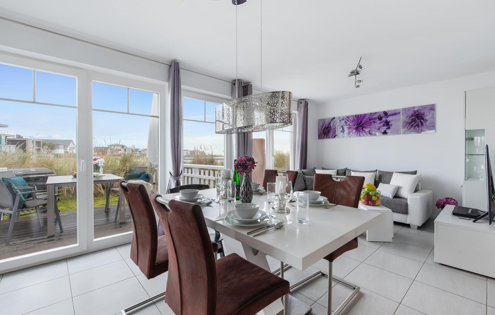 Den moderna inredningen med några få utvalda, subtila maritima detaljer utstrålar mysighet och det välutrustade pentryt är en fröjd för alla. Att tillaga en måltid här och sedan äta den antingen vid det eleganta matbordet eller på terrassen är roligt, eftersom allt åtföljs av en utsikt över stranden och vattnet.