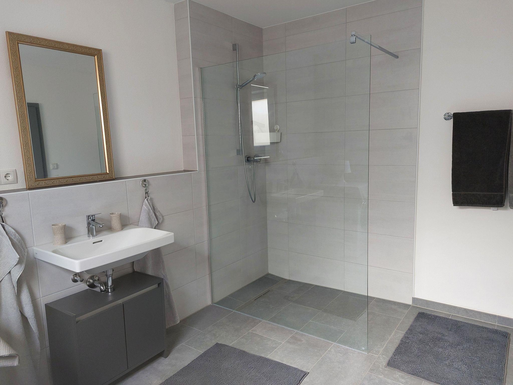 Das Bad ist ausgestattet mit einer begehbaren Dusche, Waschmaschine und Fön.