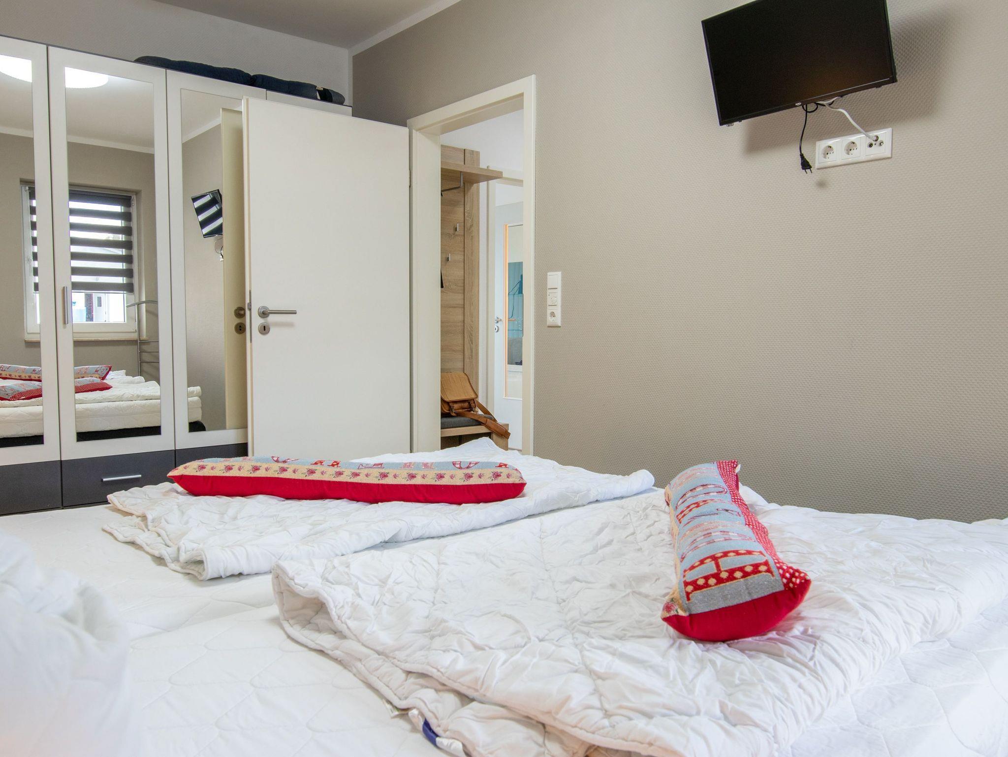 Im Schlafzimmer befinden sich ein Doppelbett und ein großer Schrank für Ihre Garderobe. Auch hier ist ein Flat-TV installiert. Das Badezimmer ist mit Dusche und WC ausgestattet. Auf dem Flur befinden sich die Garderobe und ein kleiner Schuhschrank.