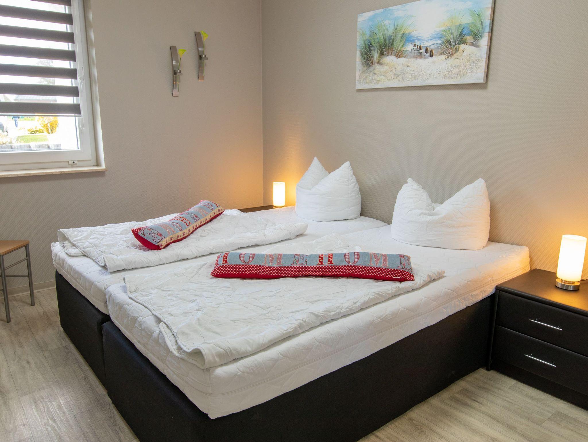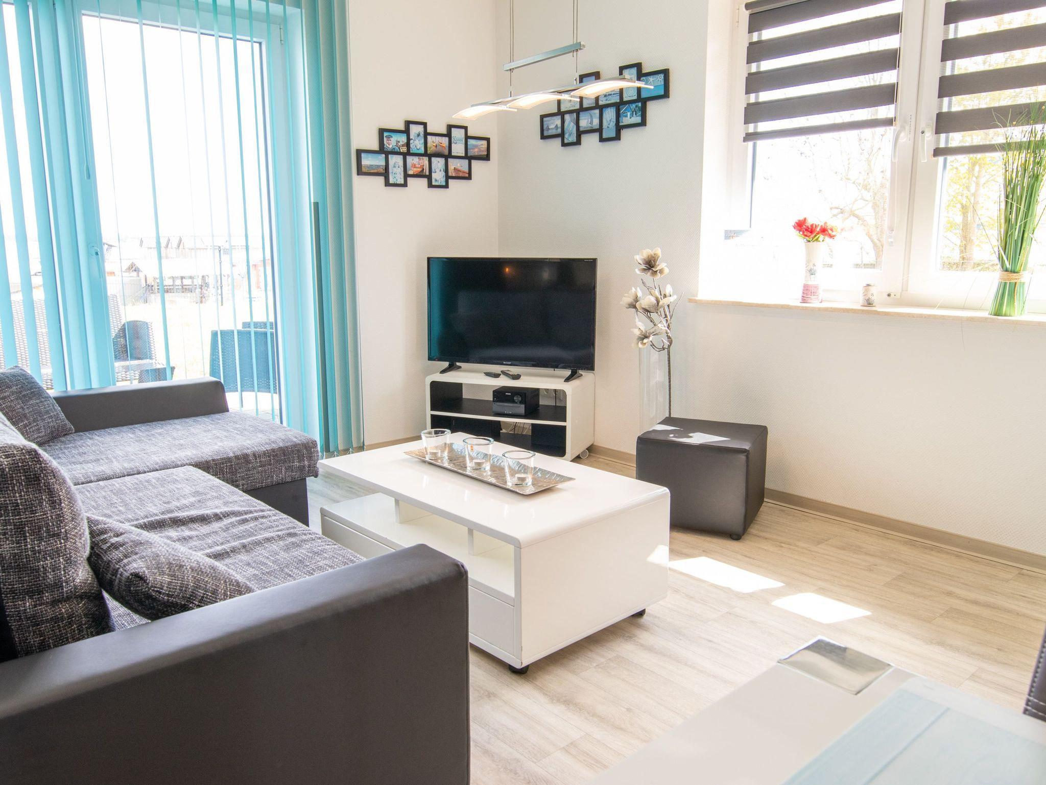 Die 48 m² große Ferienwohnung besteht aus einen Wohnzimmer mit Kamin, Flat Screen-TV, Stereoanlage und Schlafcouch (150x200) für 2 Personen. Weiterhin befindet sich im Wohnraum ein integrierter Küchenbereich mit vollausgestatteter Küche (Herd mit Backofen, Geschirrspüler, Kühlschrank mit Gefrierfach, Kühlschrank, Kaffeemaschine) und einer Essecke mit 4 Stühlen. Im Schlafzimmer befinden sich ein Doppelbett (180x200, getrennte Matratzen), ein großer Schrank für Ihre Garderobe und ein Flachbild-TV. Das Badezimmer ist mit Dusche und WC ausgestattet. Auf dem Flur befinden sich die Garderobe und ein kleiner Schuhschrank.
