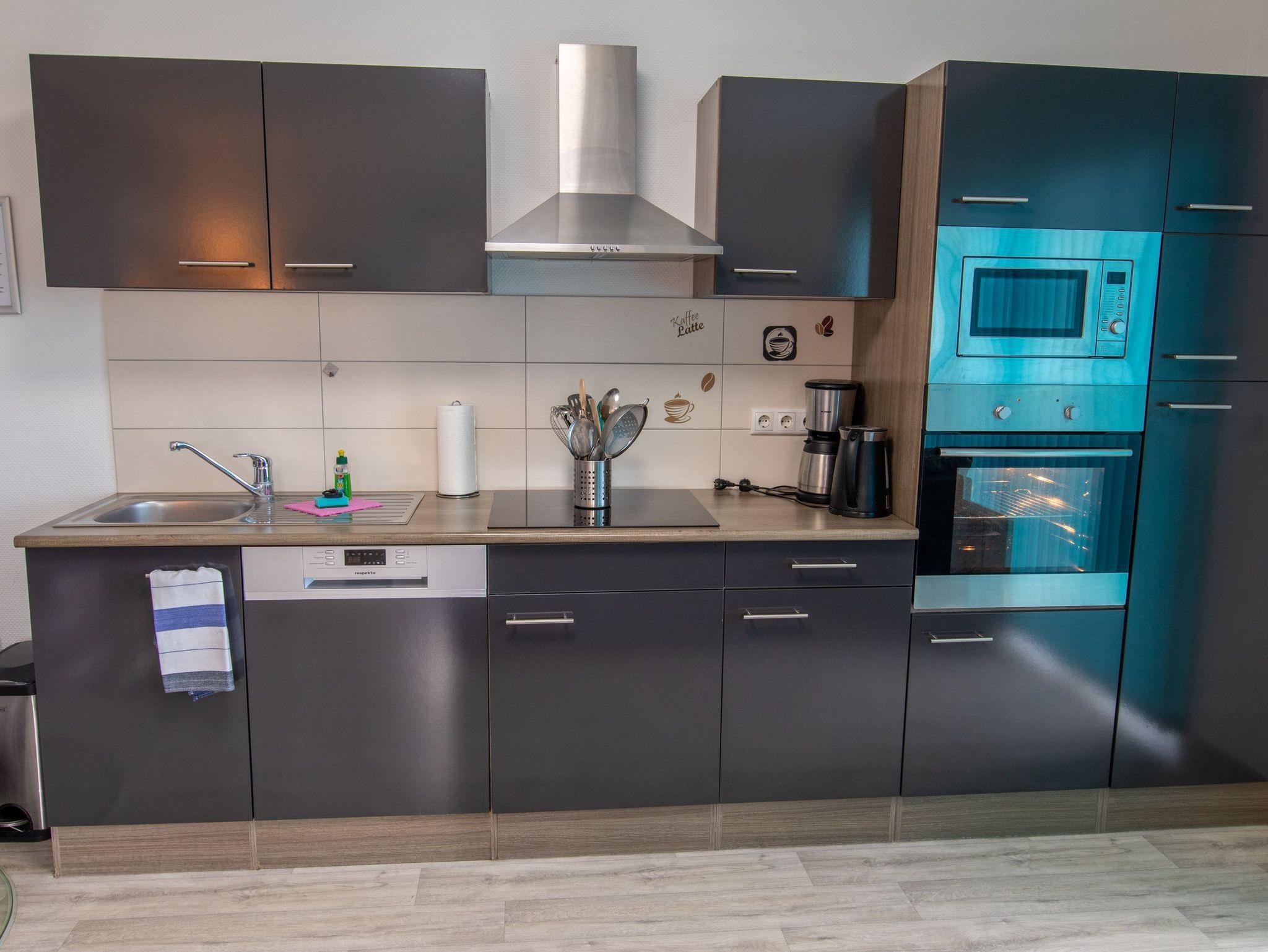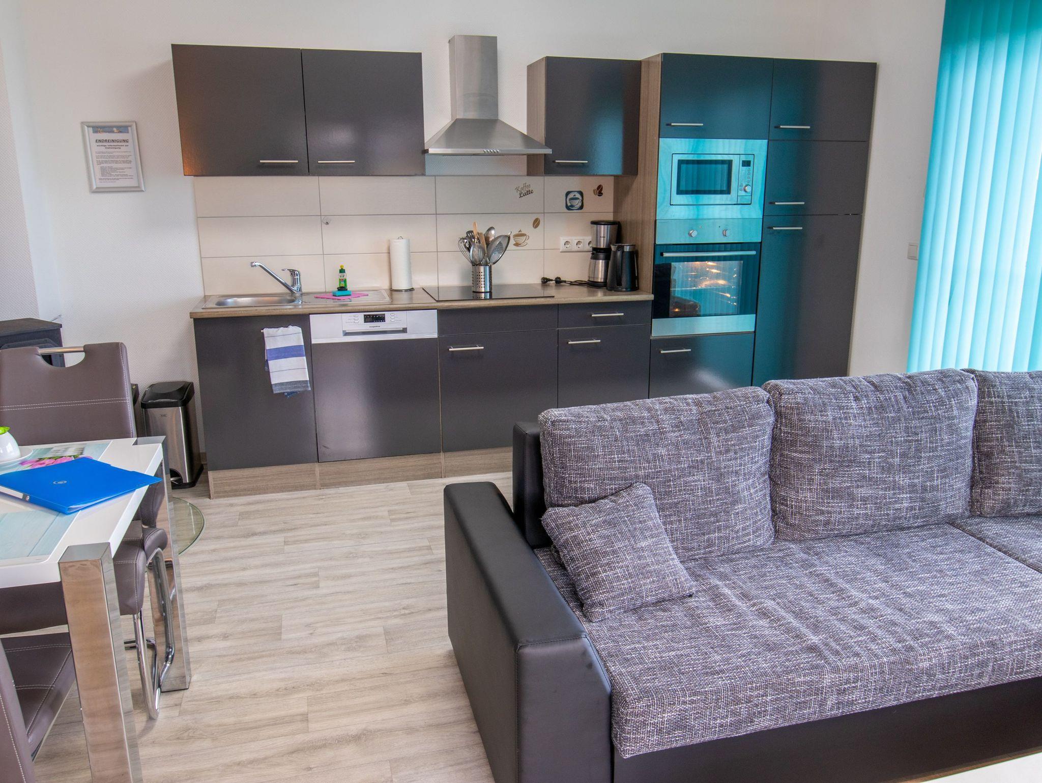 Die 48 m² große Ferienwohnung besteht aus einen Wohnzimmer mit Kamin, Flat Screen-TV, Stereoanlage und Schlafcouch (150x200) für 2 Personen. Weiterhin befindet sich im Wohnraum ein integrierter Küchenbereich mit vollausgestatteter Küche (Herd mit Backofen, Geschirrspüler, Kühlschrank mit Gefrierfach, Kühlschrank, Kaffeemaschine) und einer Essecke mit 4 Stühlen. Im Schlafzimmer befinden sich ein Doppelbett (180x200, getrennte Matratzen), ein großer Schrank für Ihre Garderobe und ein Flachbild-TV. Das Badezimmer ist mit Dusche und WC ausgestattet. Auf dem Flur befinden sich die Garderobe und ein kleiner Schuhschrank.