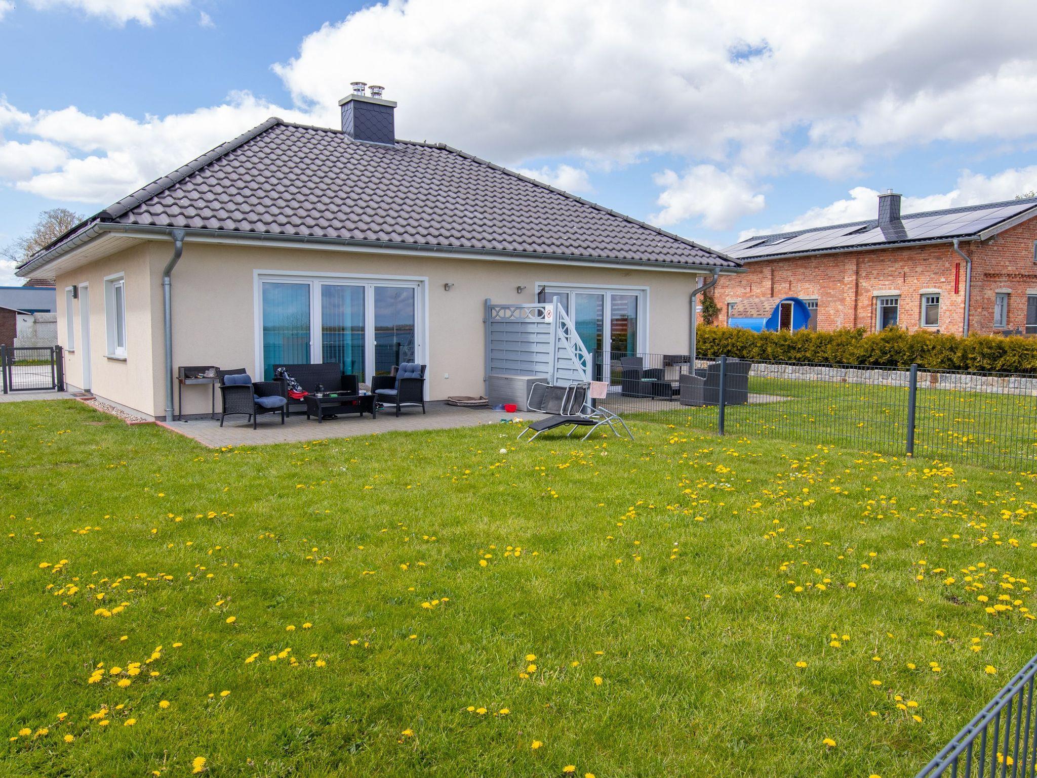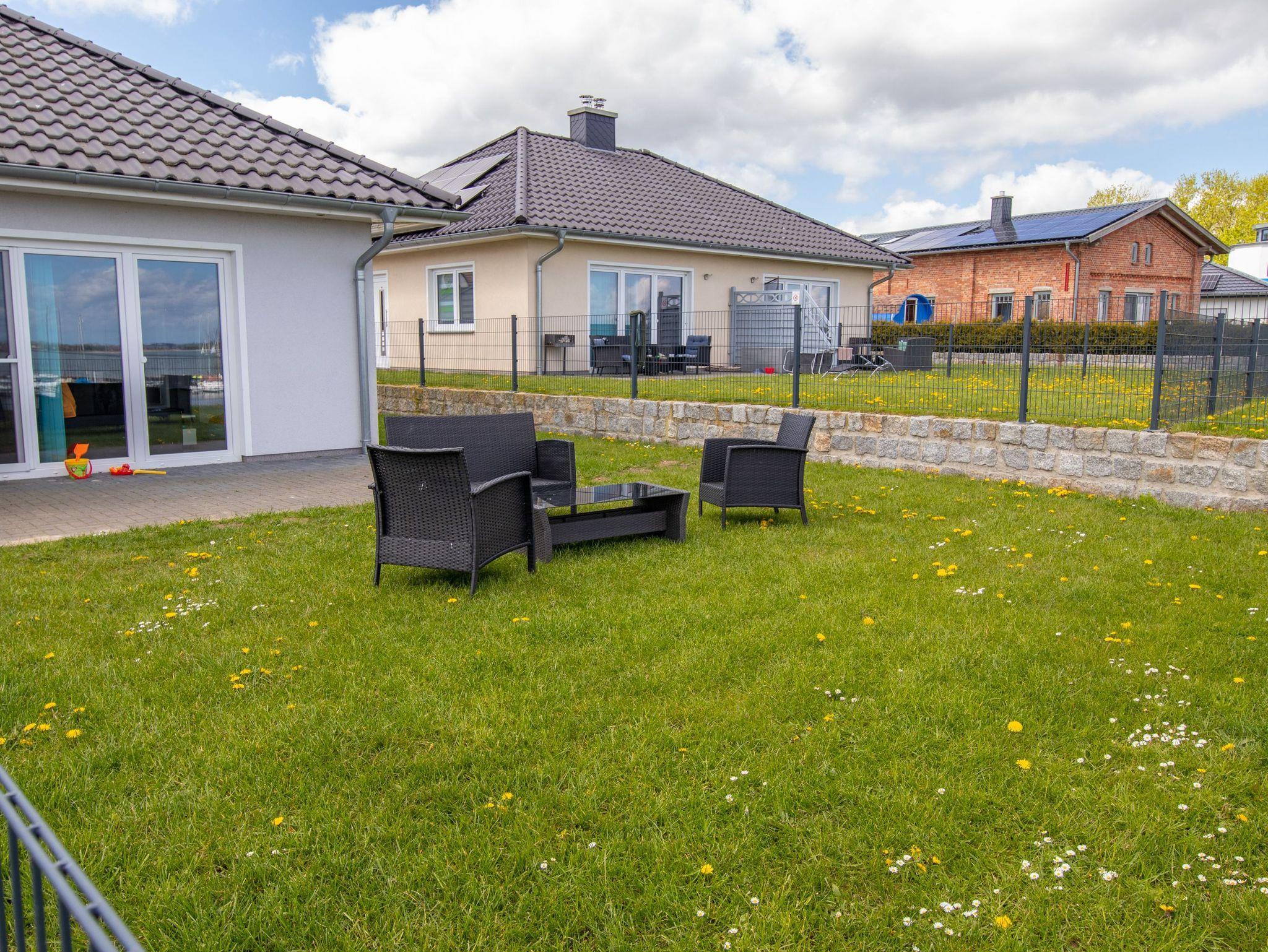 Die Terrasse ist mit Gartenmöbeln, Grill und zwei Gartenliegen ausgestattet. Das Grundstück ist umzäunt und somit auch für Kinder und Hunde bestens geeignet.