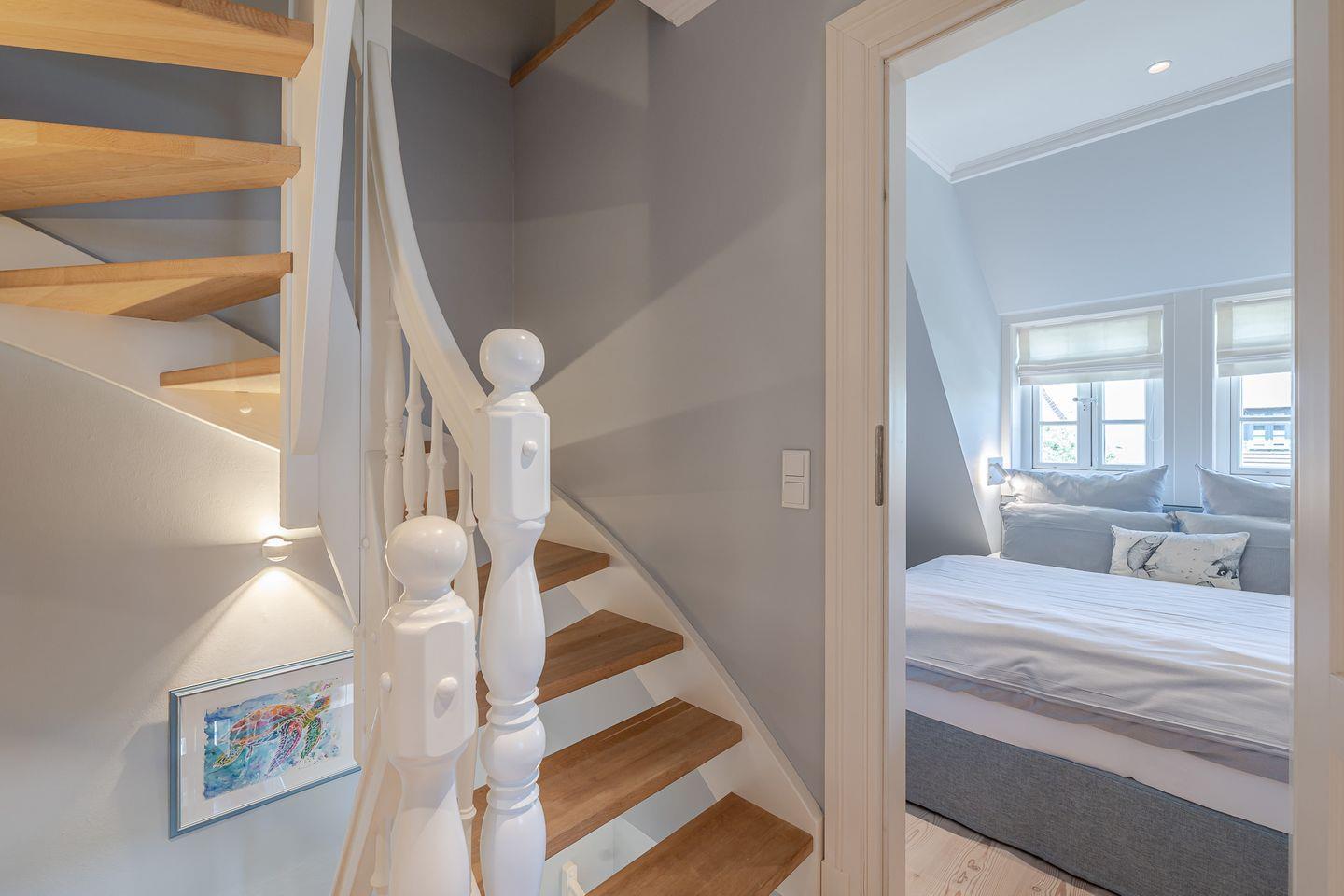 Im Obergeschoss erwarten Sie zwei helle Schlafzimmer, beide mit Doppelbetten, maßgefertigten Tischlereinbauten und jeweils einem kleinen Schreibtisch – ideal, falls während des Urlaubs doch einmal gearbeitet werden muss. Hier finden sich Rückzugsorte, die Ruhe und Erholung schenken. Ein modernes Duschbad steht den Schlafzimmern zur Verfügung, während im Erdgeschoss ein zusätzliches Gäste-WC den Komfort abrundet. Besonders praktisch ist auch der eigene Hauswirtschaftsraum mit Waschmaschine und Trockner, der den Aufenthalt angenehm unkompliziert macht.
