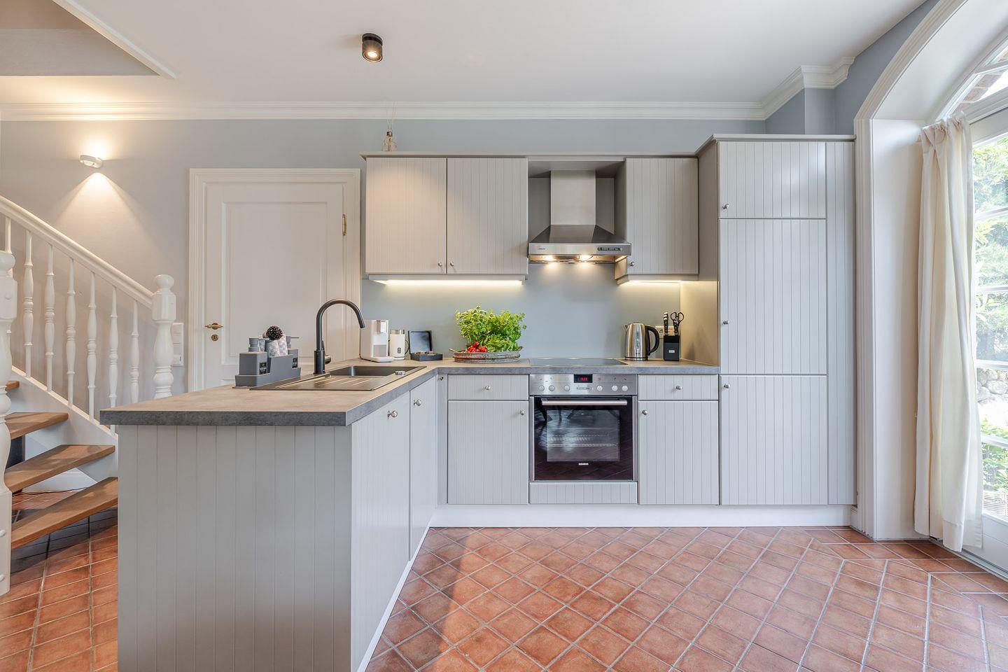 Das Erdgeschoss empfängt seine Gäste mit einem lichtdurchfluteten Wohnbereich, der sofort eine warme und behagliche Atmosphäre schafft. Herzstück ist die offene, voll ausgestattete Küche mit Spülmaschine, Backofen und allen modernen Geräten, die das Kochen zum Vergnügen machen. Hier wird nicht nur gekocht, sondern gemeinsam genossen – ob ausgedehntes Frühstück am großen Esstisch, ein feines Abendessen oder gesellige Stunden mit Familie und Freunden. Der angrenzende Wohnbereich mit Sofa und stilvollen Details lädt zu entspannten Abenden ein, an denen man bei einem Glas Wein oder einem guten Film einfach die Seele baumeln lässt.