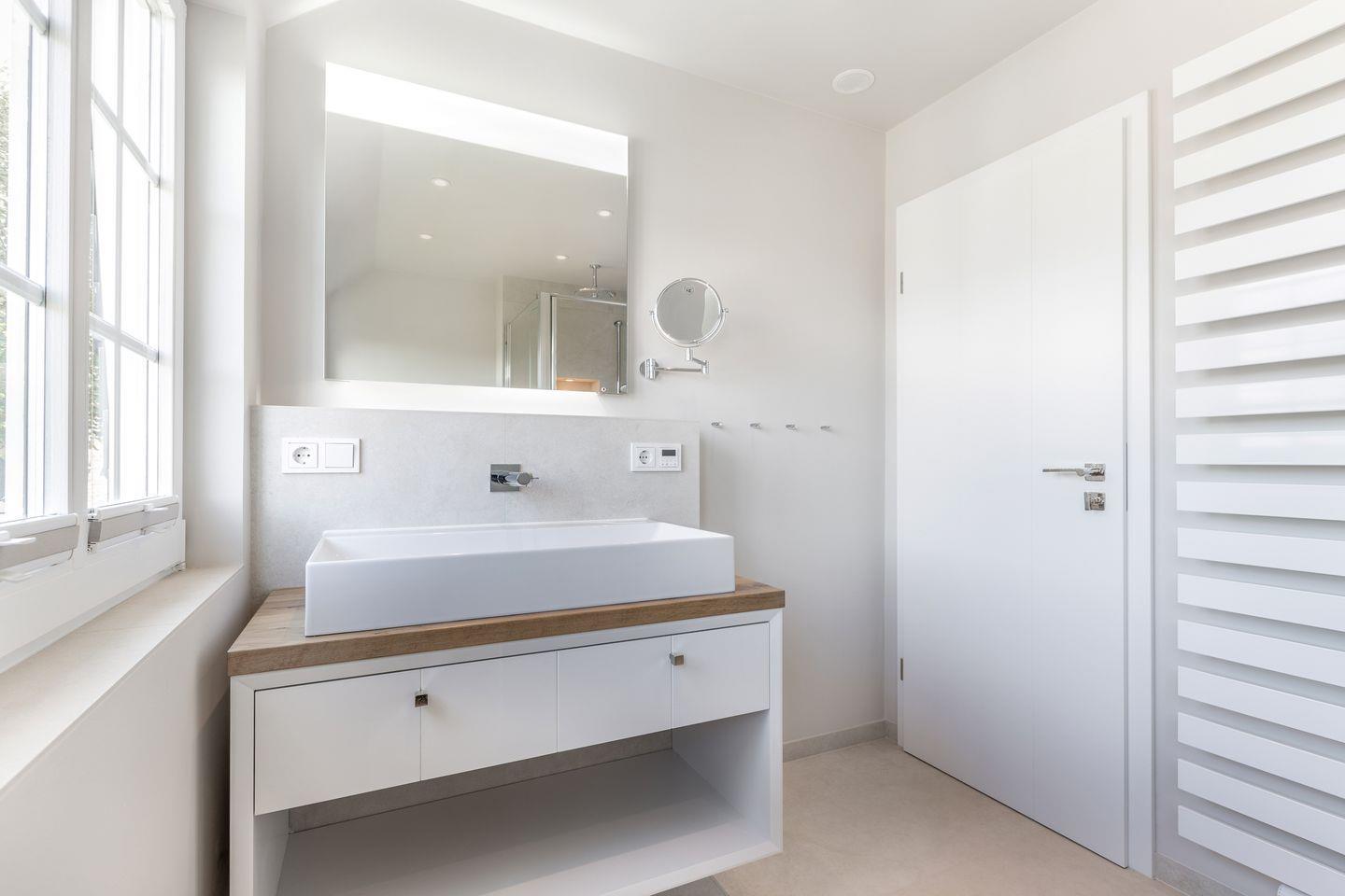Das Tageslichtbad überzeugt mit klarer, moderner Gestaltung: Eine großzügige, ebenerdige Dusche, hochwertige Armaturen und helle Fliesen schaffen eine ruhige, elegante Atmosphäre.